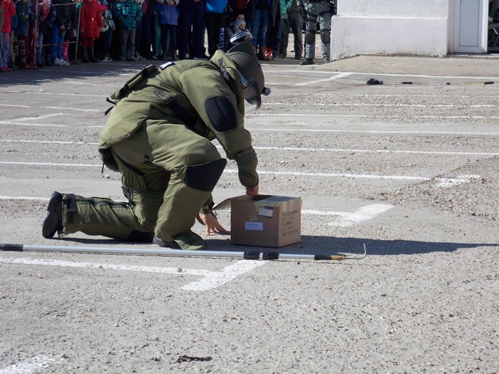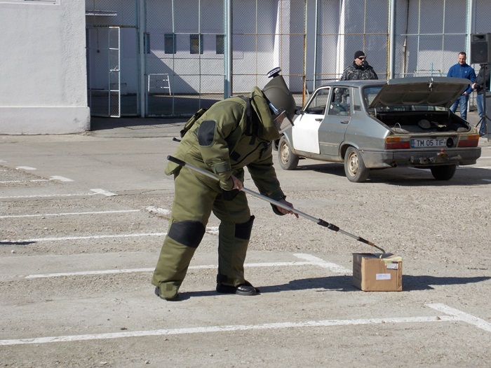 Prichindeii au urmarit curiosi si demonstratia genistilor care, echipati in costumele speciale, au verificat un colet suspect.