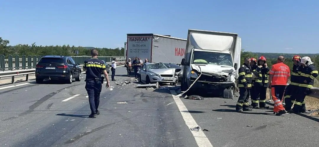 TIMISOARA. Accident la Margina, în Timiș, vineri, la coborârea de pe Autostrada A1. Au fost implicate 5 mașini, o camionetă și un TIR. 11 oameni se aflau în toate aceste mașini, în momentul impactului.