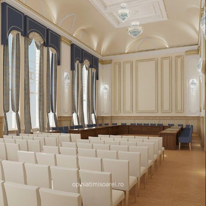 Cinci luni se va afla sala in santier, aceasta avand o cu totul alta infatisare dupa finalizarea lucrarilor, una mult mai eleganta, sustin reprezentantii municipalitatii. Potrivit primarului Nicolae Robu, sala in care se desfasoara sedintele de consiliu local ar trebui sa aiba mesele pe mijloc, iar in stanga si in dreapta sa fie asezate scaunele pentru cei ce participa la sedinte. Din imaginile obtinute de la reprezentantii Primariei Timisoara se vede insa altceva. Mesele sunt puse in aceeasi parte in care se gasesc si acum.