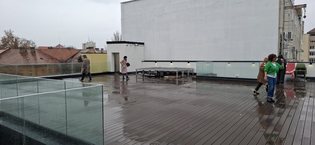 La ultimul nivel este terasa, unde vara vor putea fi facute proiectii de film, direct pe zidul hotelului din vecinatate, si de unde poate fi admirat si castelul Huniade.