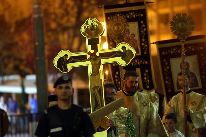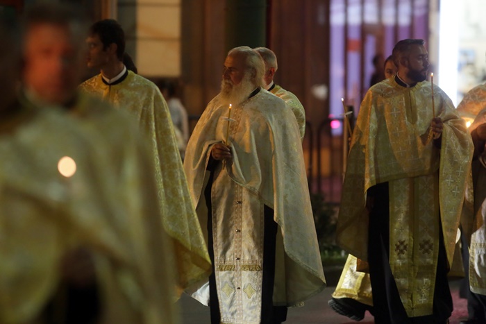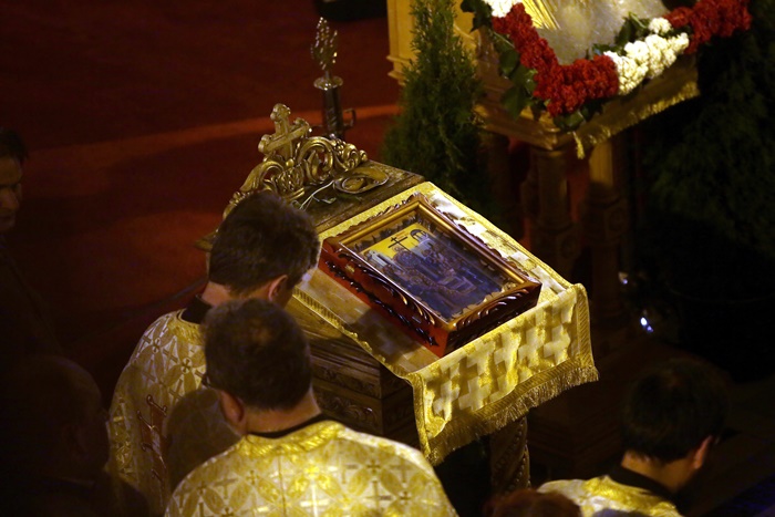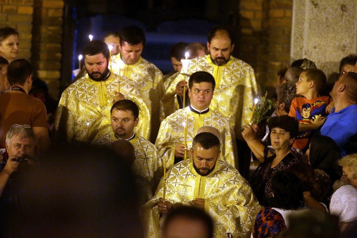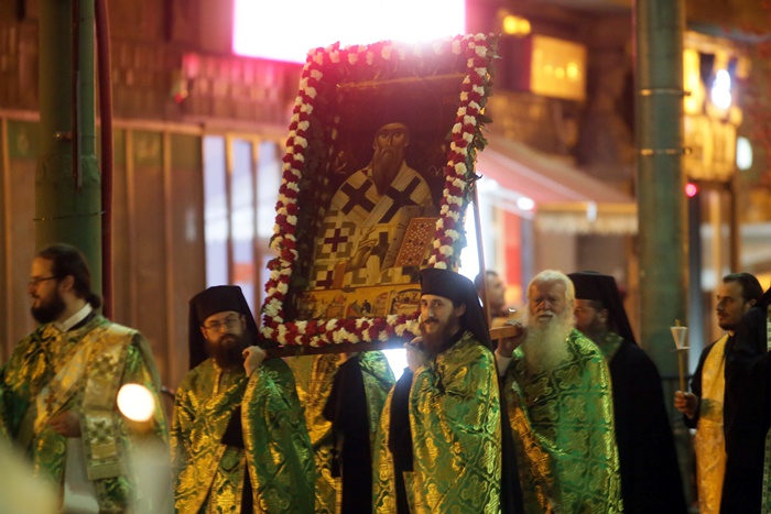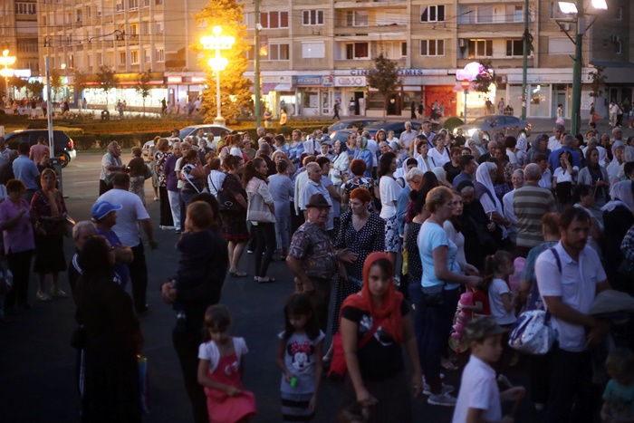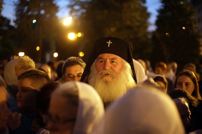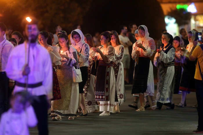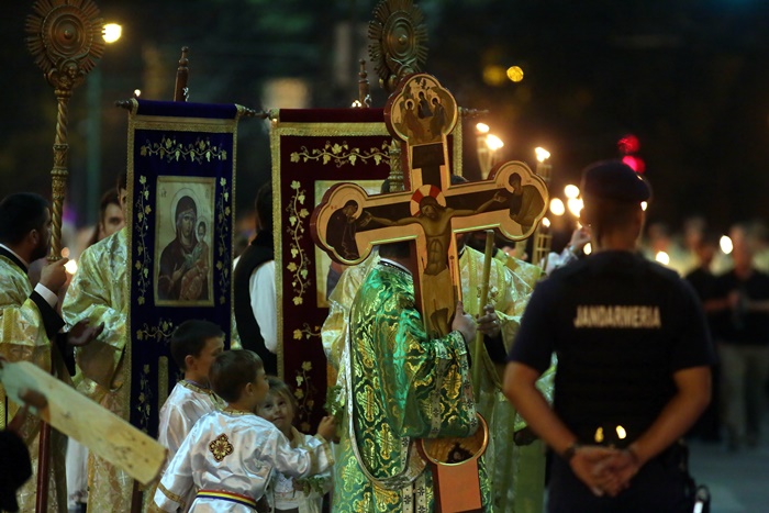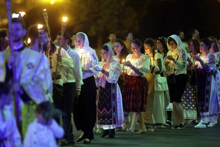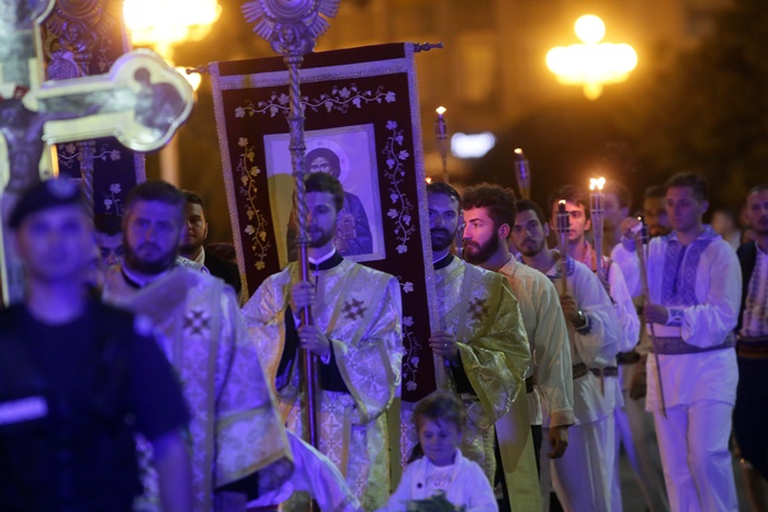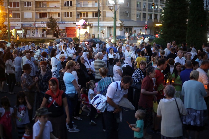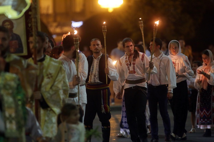 Imediat dupa slujba de vecernie, Mitropolitul Banatului, Ioan Selejan, a coborat pe platoul din fata Catedralei si i-a binecuvantat pe credinciosii veniti la procesiune. Preotii si enoriasii au pornit apoi, cu racla in care se afla moastele Sfantului Iosif cel Nou de la Partos, in jurul Catedralei.