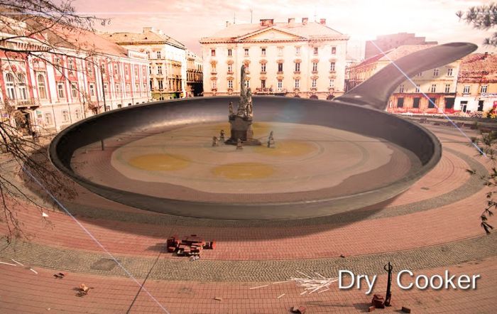 Pe Facebook circula o imagine cu un Dry Cooker urias in Piata Libertatii, in mijlocul acesteia fiind pus monumentul existent in piata. Potrivit internautilor, forma pavajului din Libertatii se potriveste de minune cu aspectul unei tigai de acest fel.