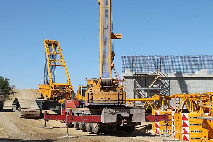 Dupa ce trecem de intersectia cu drumul judetean D681 Faget – Dragsinesti, continuam pana ajungem la primul mare viaduct de pe acest lot. Aici surprindem montarea unei macarale de mari dimensiuni ce ar urma sa ridice si sa pozitioneze pilele viaductului. Un muncitor de pe santier ne asigura ca este cea mai mare macara de acest tip adusa in Romania si ca numai montarea ei dureaza circa 4 zile.