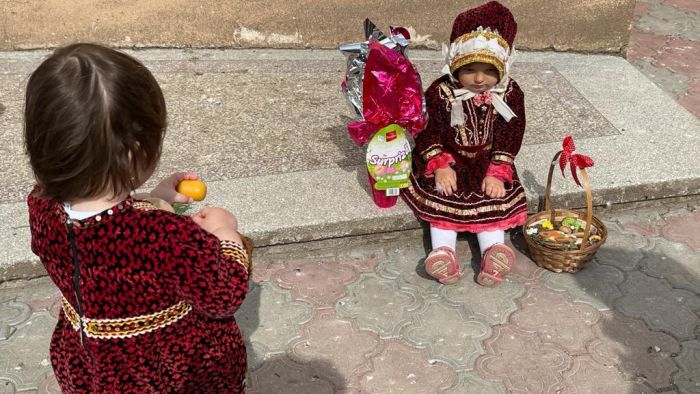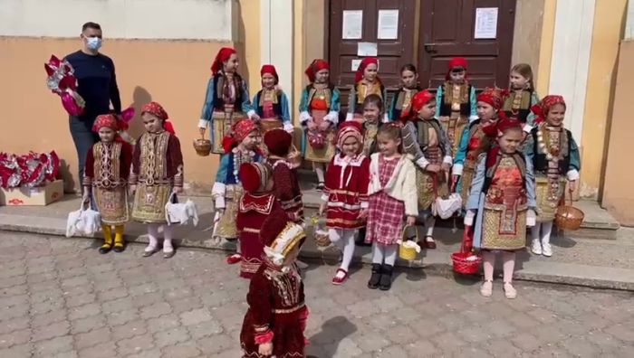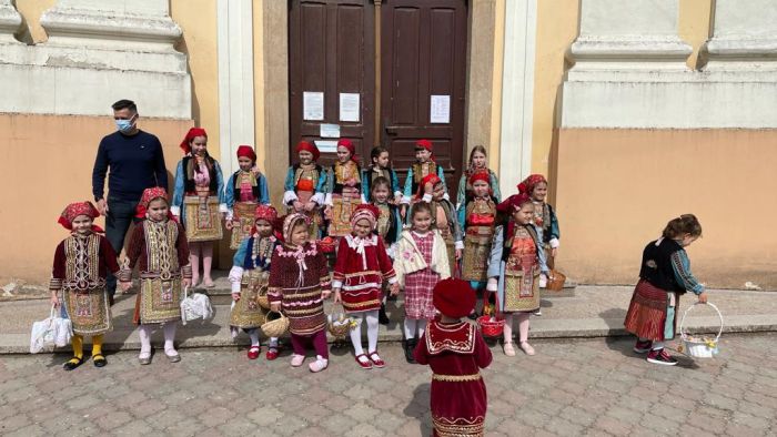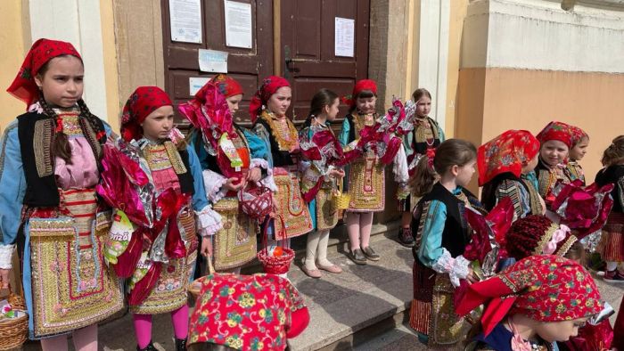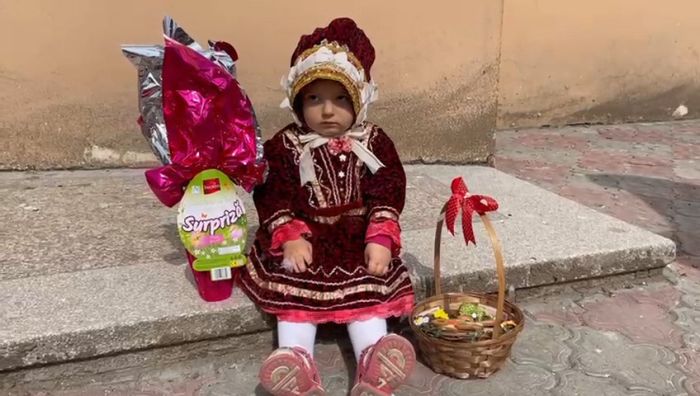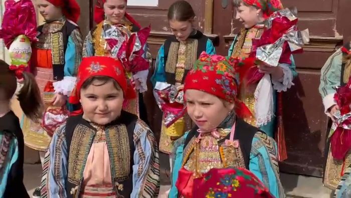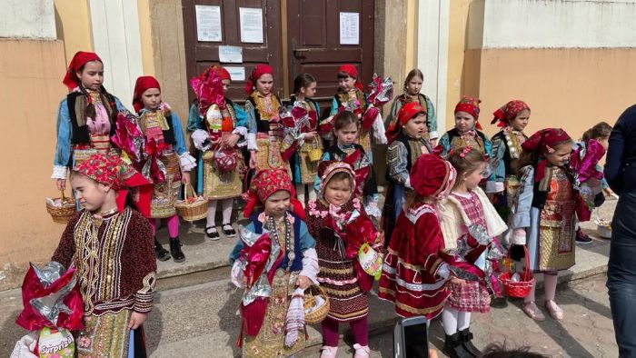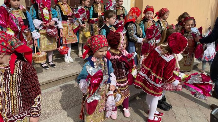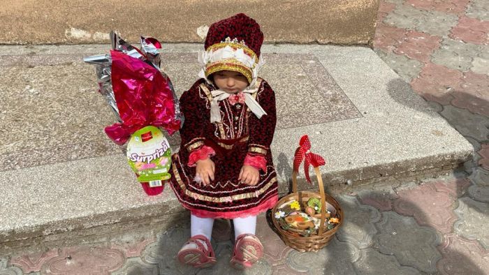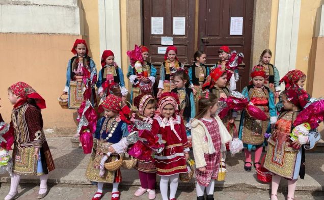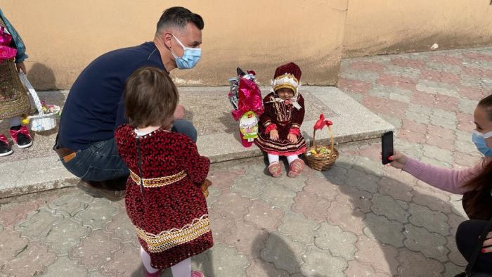 In costumele de sarbatoare, fetitele sunt superbe si par niste papusi vii, asezate in pragul bisericii din localitate, pe cand vestesc sarbatoarea de Florii la catolici, care are loc duminica.