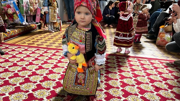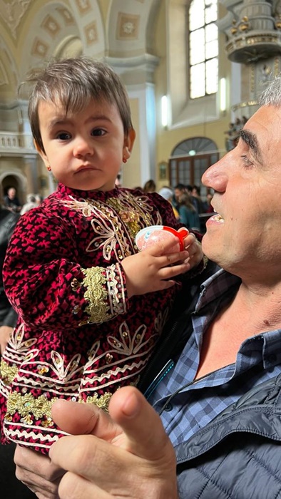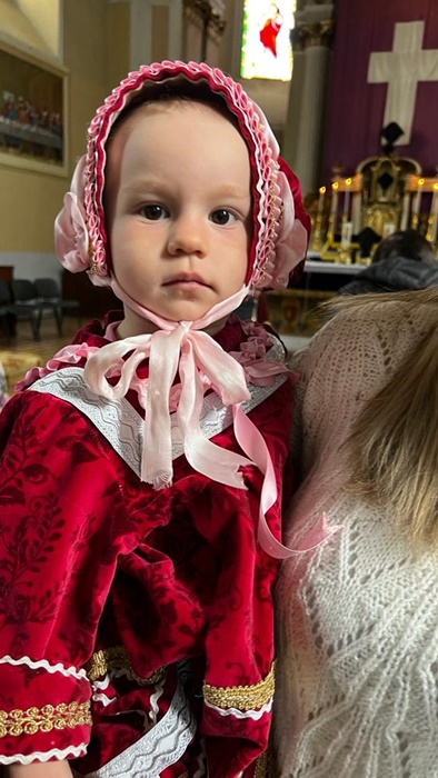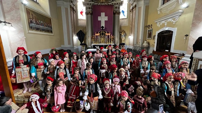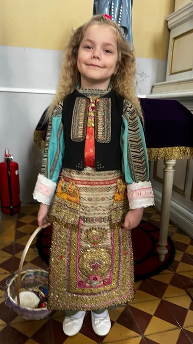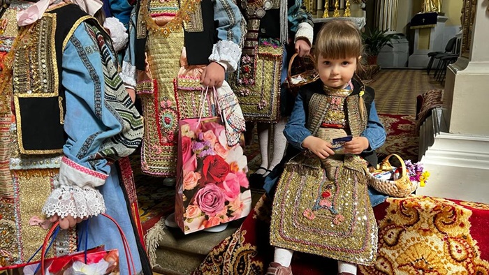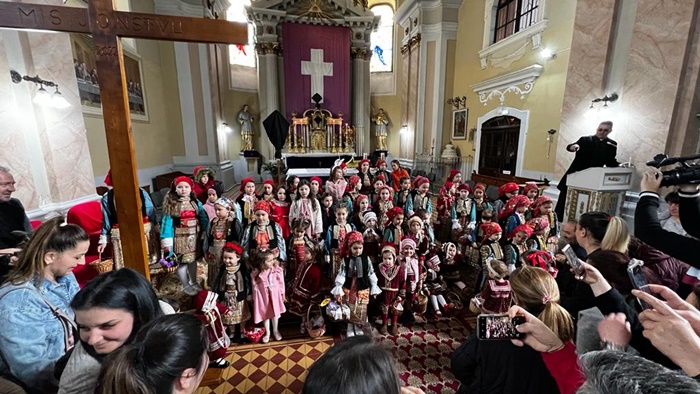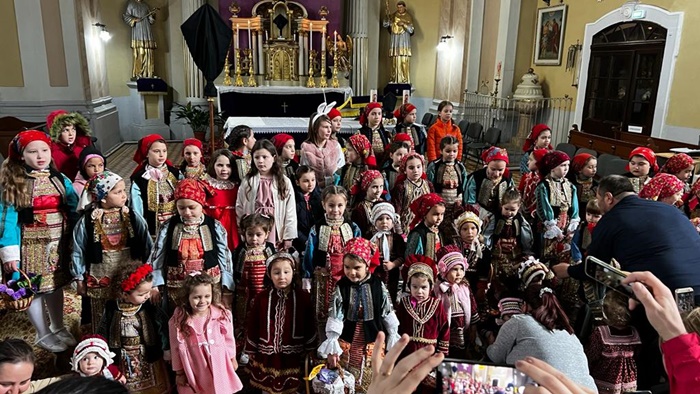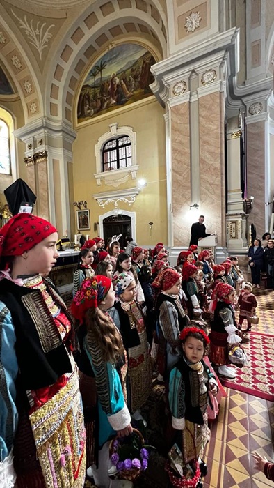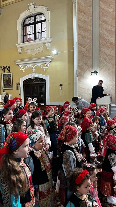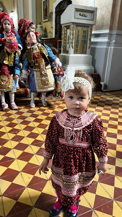 Micutele ce poarta coloratele costume populare s-au adunat mai intai la biserica pentru a vesti sarbatoarea Floriilor.