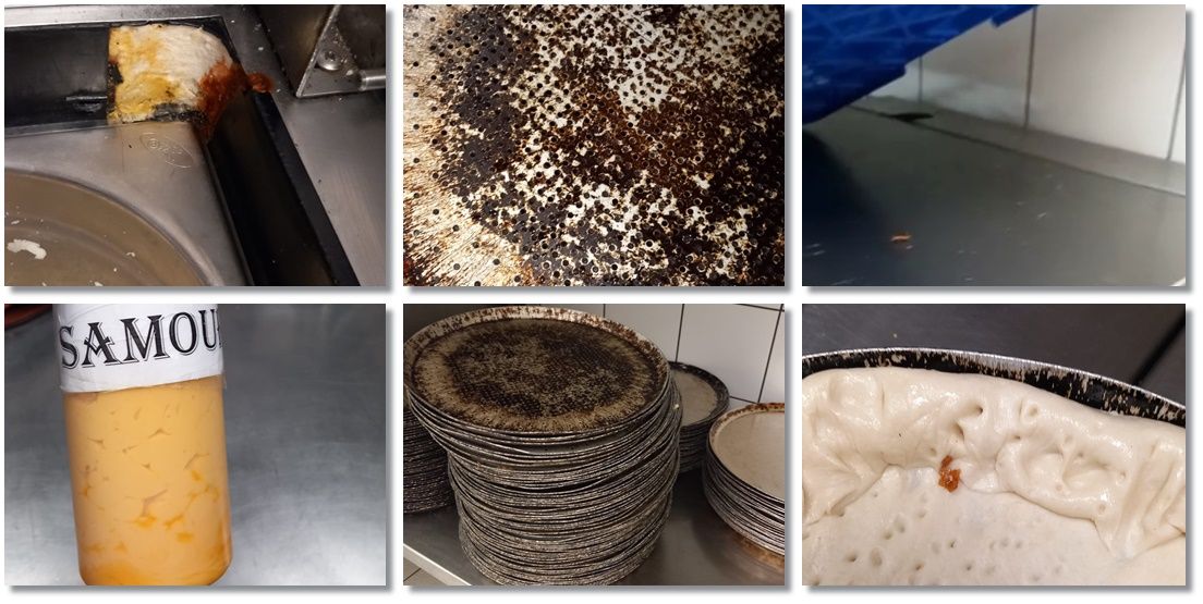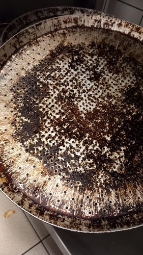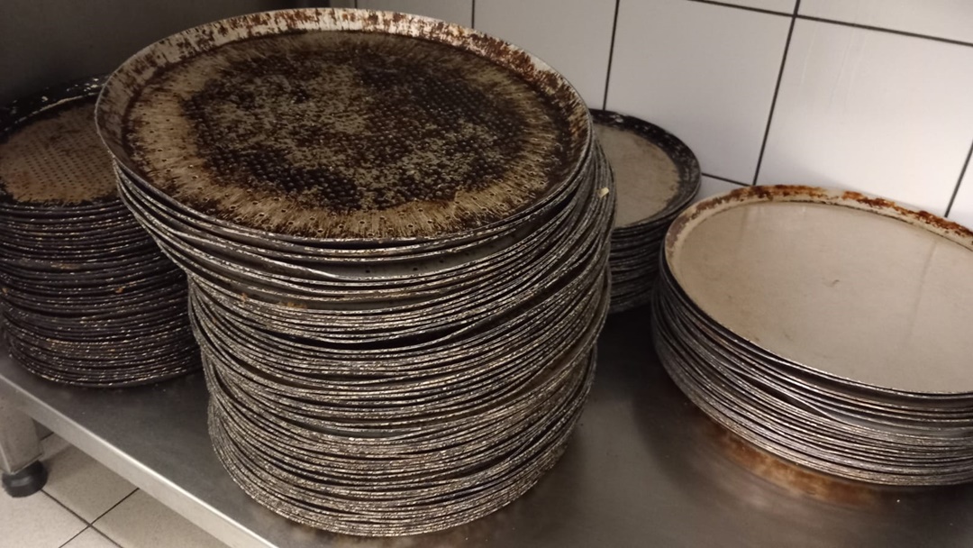 – Tavile utilizate in vederea coacerii blatului de pizza neigienizate corespunzator, pastrate unele peste altele, innegrite de arsura si cu depuneri consistente de grasimi intarite, resturi alimentare,