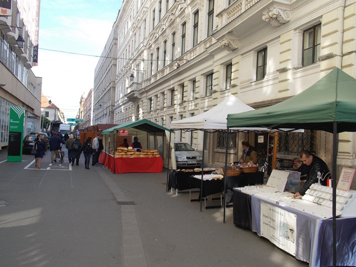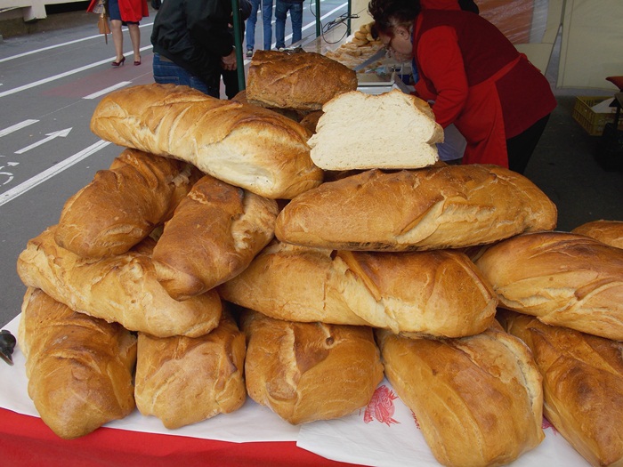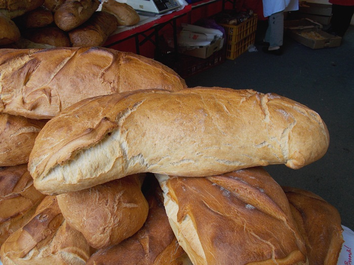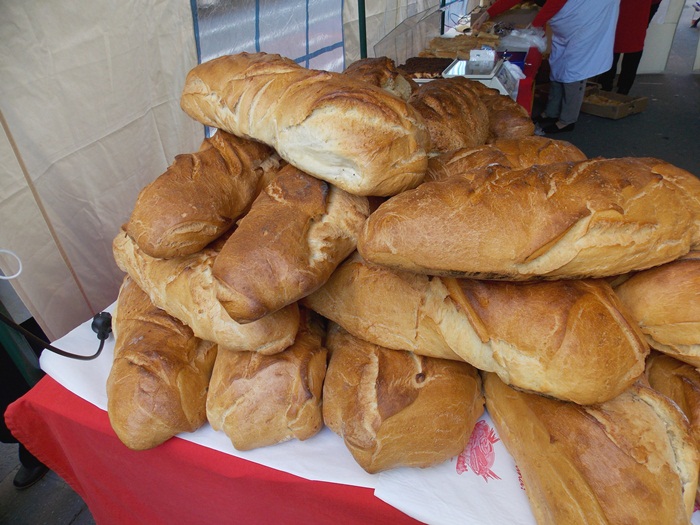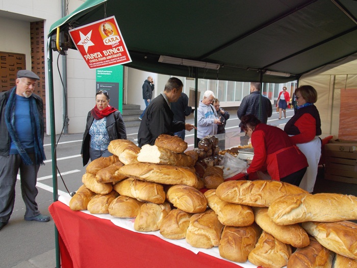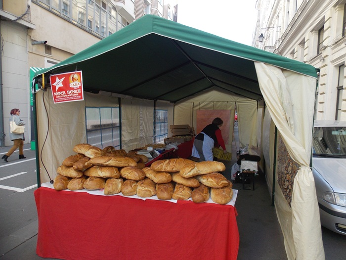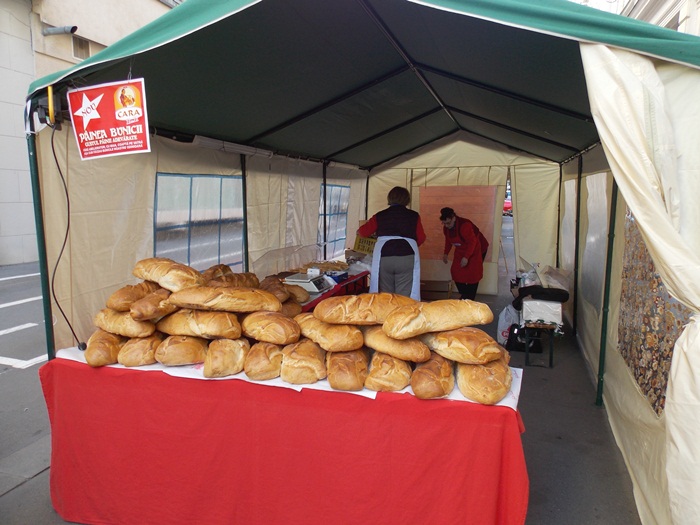 Doar sapte producatori au venit de la ora deschiderii targului pentru a-si expune produsele pe standuri, iar musterii au inceput sa roiasca in jurul tarabelor. Atractia principala pare sa fie paine uriasa adusa de un producator din Arad, care costa 8 lei/kg si poate fi vanduta si la bucata, taiata dupa pofta clientului, daca nu faci vreun gratar acasa cu prietenii si vrei sa iei una intreaga.