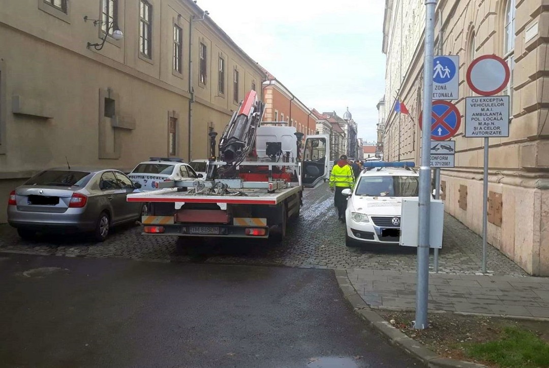 TIMISOARA. Vanatoare de soferi indisciplinati in zona centrala la Timisoara. Politistii locali actioneaza pe strazile pietonale de unde ridica pe banda rulanta masinile soferilor care sfideaza legea si parcheaza in locuri interzise.
