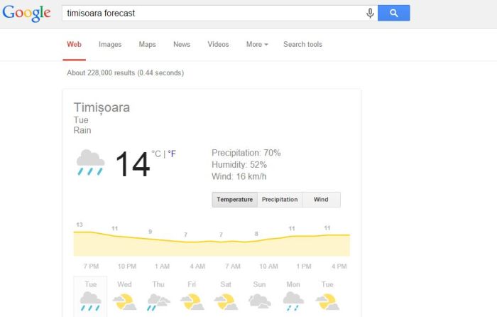 In primul rand, cu Google putem afla vremea. Tot ce trebuie sa facem este sa tastam numele orasului pentru care vrem sa aflam meteo, urmat de “forecast”. Totodata, Google poate fi folosit si pe post de cronometru, cu textul “set timer for…”.