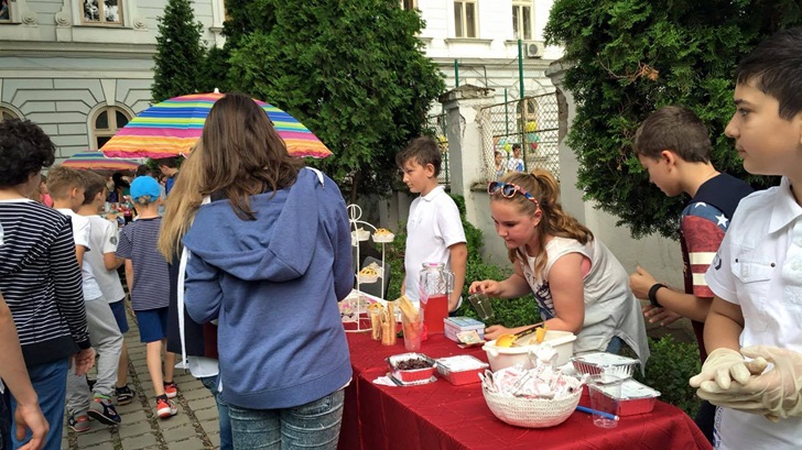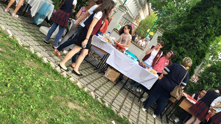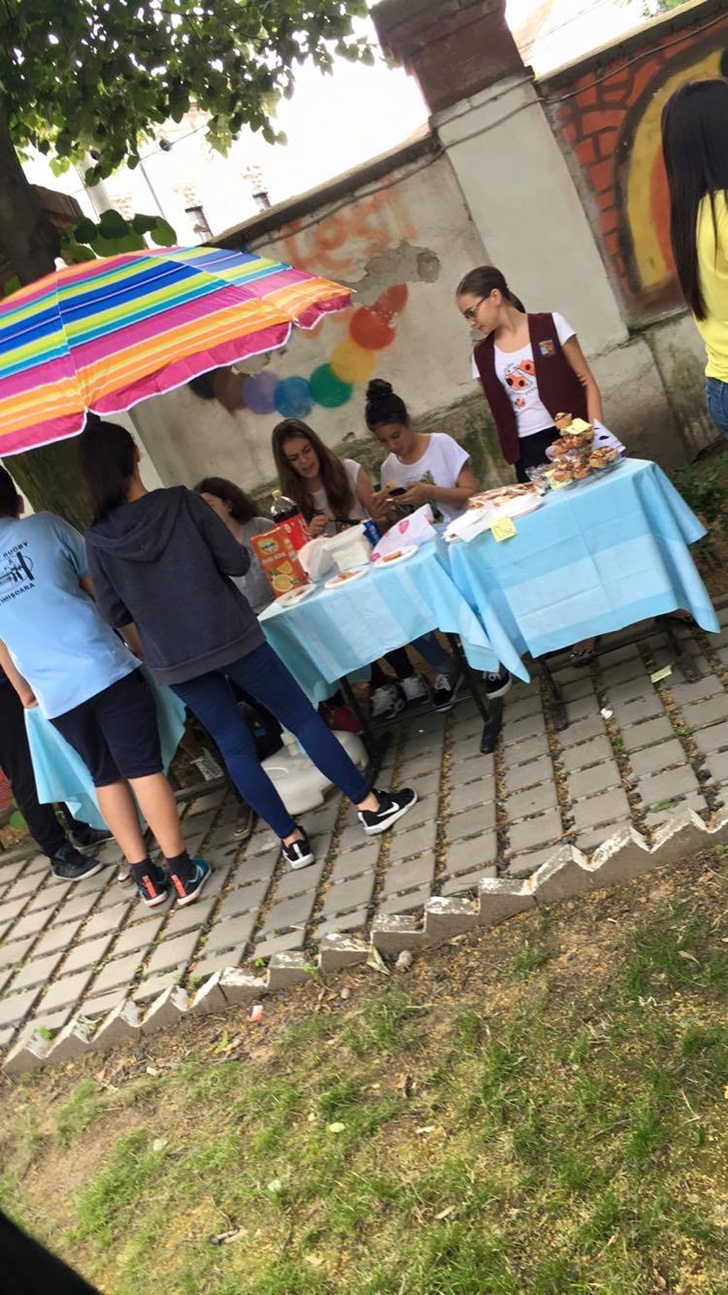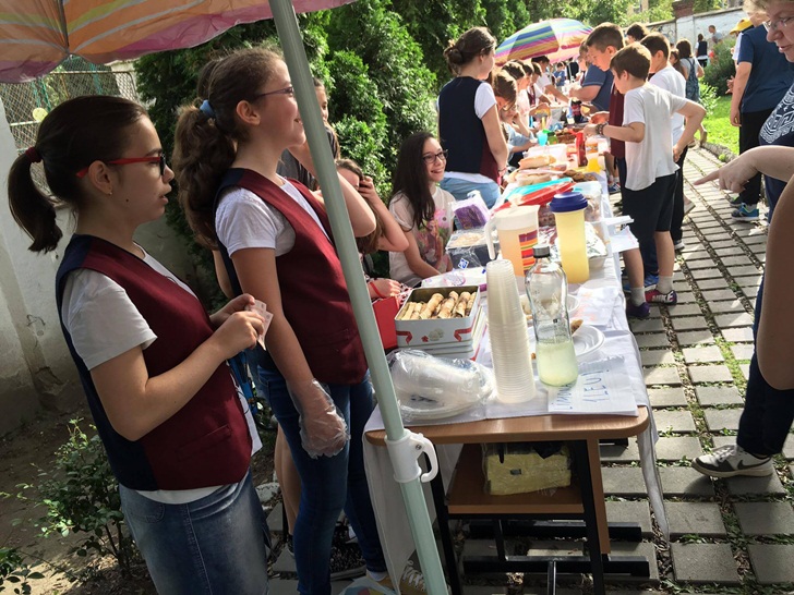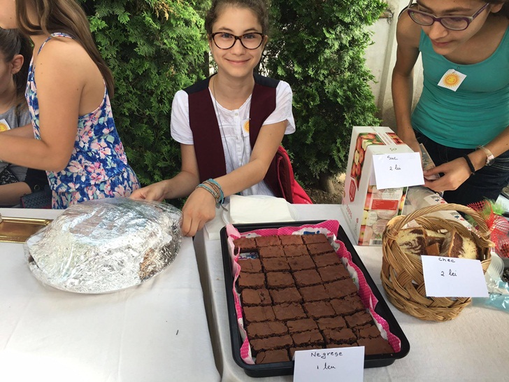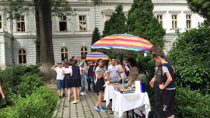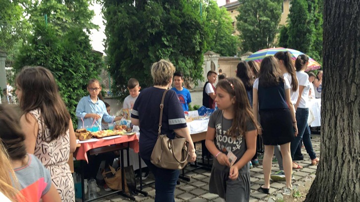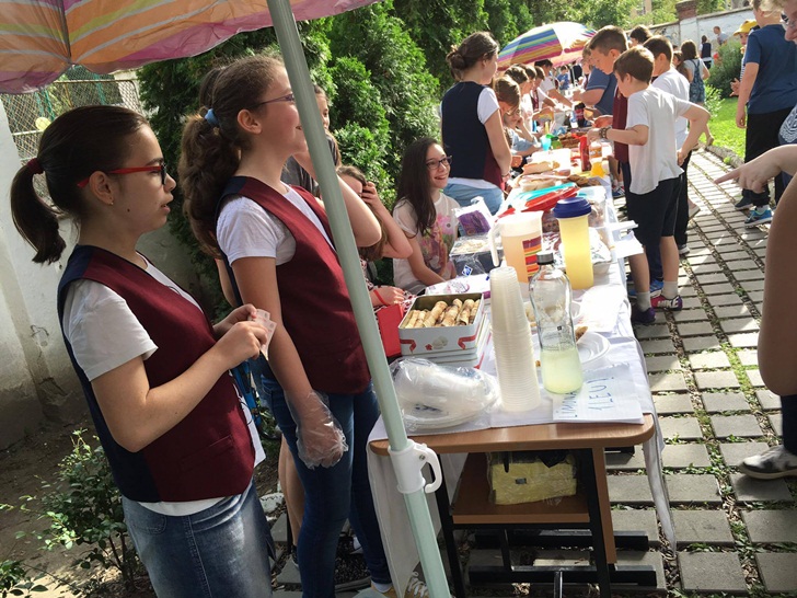 Inca de dimineata, elevii de la mai multe clase de gimnaziu si-au intins pe mese produsele si si-au asteptat clientii. Au scos la vanzare briose, negrese, clatite cu gem, cornulete si joffre, langa care au asezat sucuri proaspete. Spera sa stranga cat mai multi bani, care vor ajunge la copii mai putin norocosi decat ei.