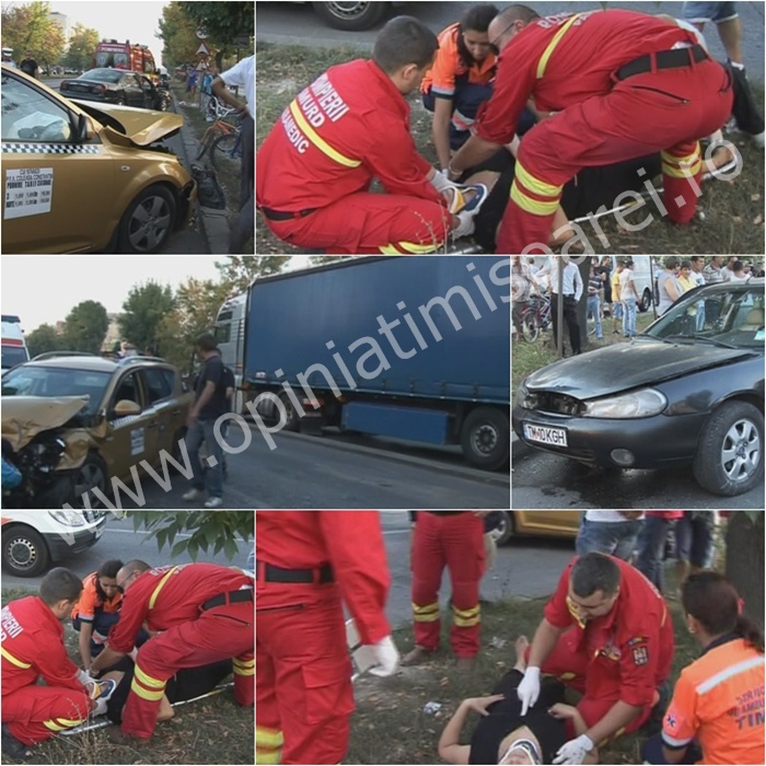 TIMISOARA. Accident grav de circulatie la iesirea din Timisoara, pe Calea Sagului. Soferul unui Ford a schimbat banda de mers fara sa se asigure si a fost acrosat de un tir si proiectat intr-un taxi care mergea regulamentar.