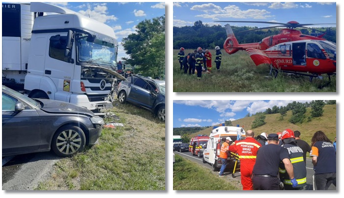 Totul s-a intamplat miercuri dupa amiaza, dupa ce un sofer ar fi intrat pe contrasens si ar fi lovit in plin tirul, care circula regulamentar. In urma impactului, un om a ramas prins intre fiarele contorsionate ale masini. Acesta fost scos de pompieri si predat, inconstient, echipajului de pe elicoperul SMURD, pentru a fi dus de urgenta la spital. O a doua victima implicata in accident a fost dusa la spital cu ambulanta, pentru a primi ingrijiri medicale.