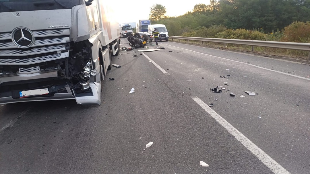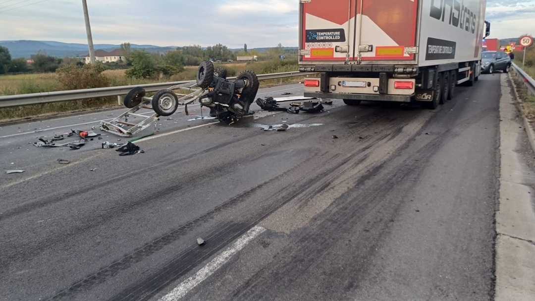 In urma impactului, remorca s-a rasturnat in mijlocul soselei.