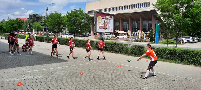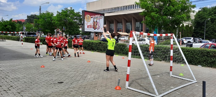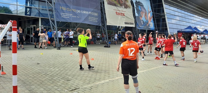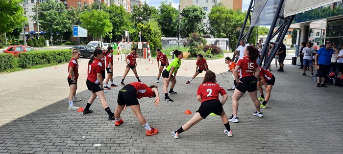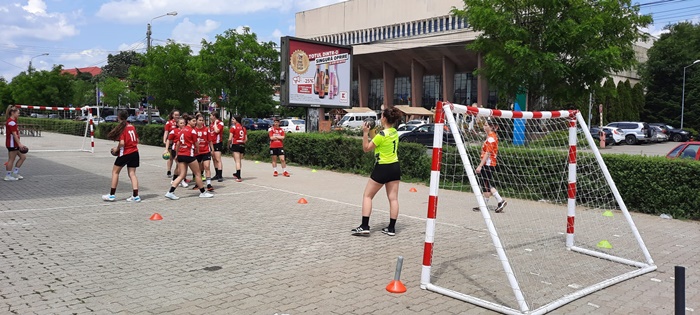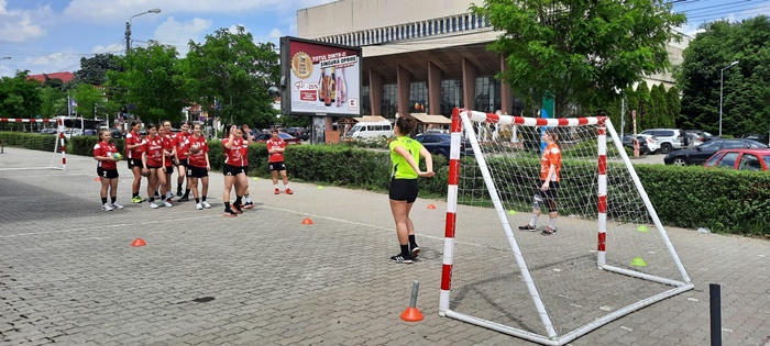 Dupa intalnirea cu fanii, fostii detinatori ai Cupei Romaniei au iesit din cladire pentru a asista la o demonstratie de handbal facuta de fetele de la clubul din Dumbravita.