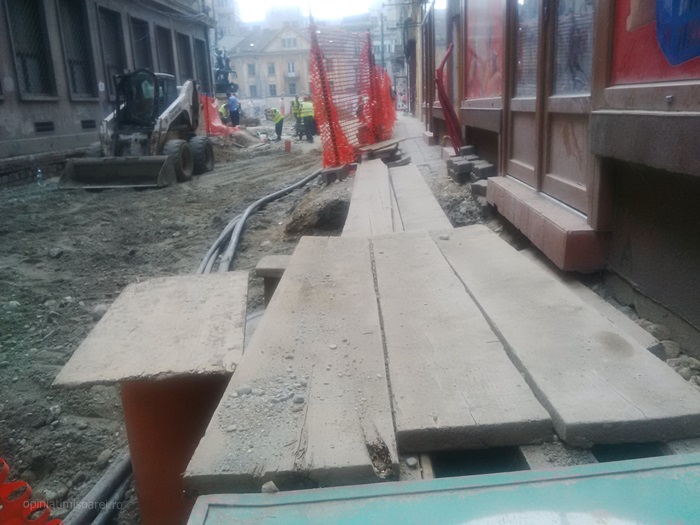 Pe cele mai multe strazi aflate in lucru au fost sparte si trotuarele, fiind puse din loc in loc punti de lemn care sa fie folosite de trecatori.
