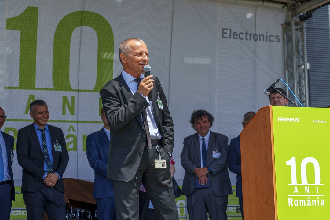 „Plecând de la zero în urmă cu 10 ani, iar acum, cu peste 350 de angajați dedicați și pasionați, producem materiale pentru industria electronică. Acesta este angajamentul nostru pe termen lung față de clienții noștri, parteneri, angajați și regiune.” – Manuel Fischer, Vicepreședinte Executiv și Director Global al Resurselor Umane, Marketing și Comunicare la Heraeus Electronics.