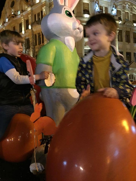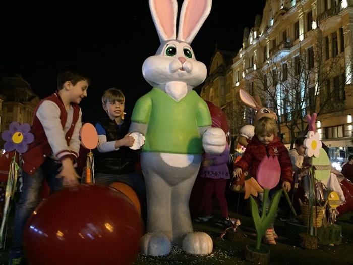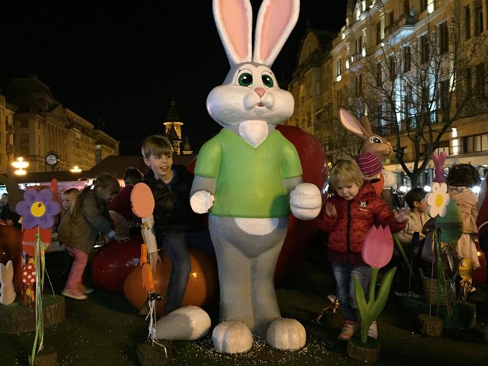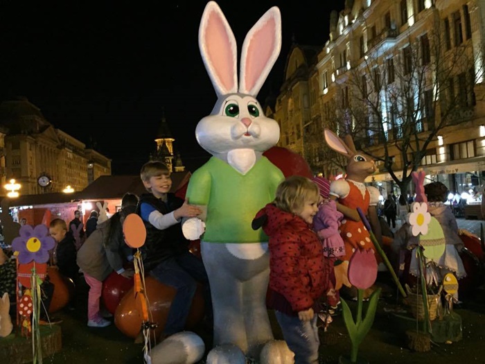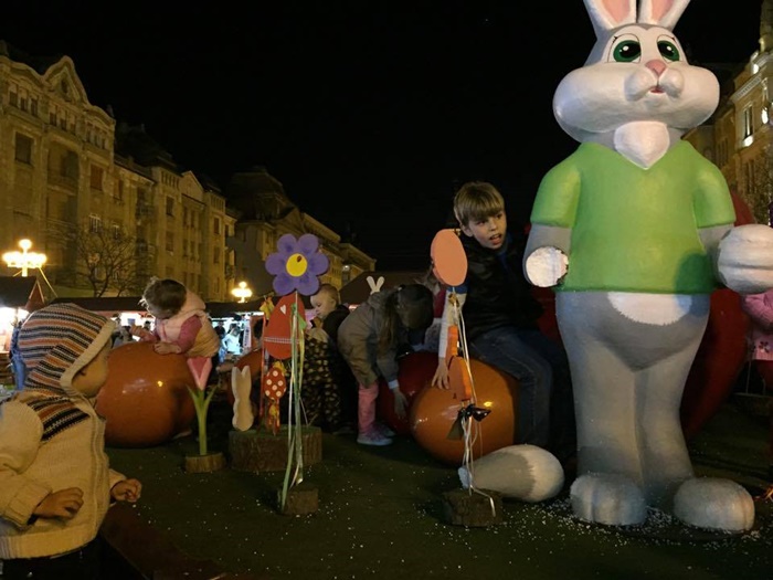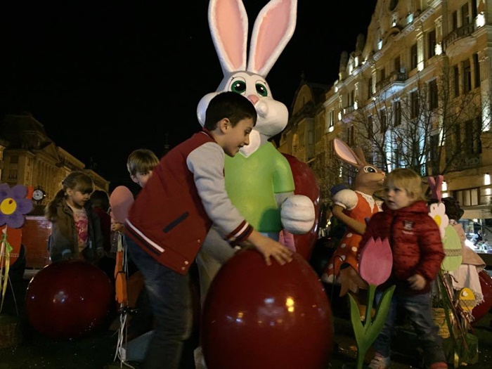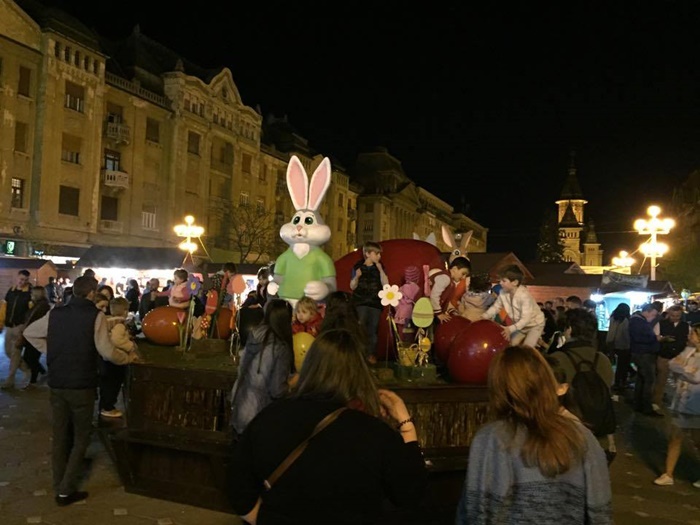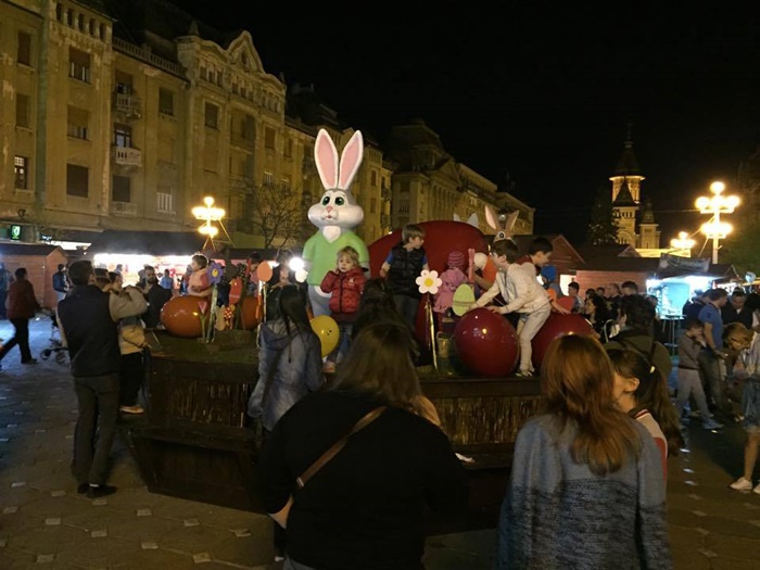 TIMISOARA. Ornamentele de la Targul de Pasti din Piata Operei au atras ca un magnet copiii. Atractia numarul unu in centrul Timisoarei in aceste zile o reprezinta cuibul cu oua si iepurasi in chip de personaje.