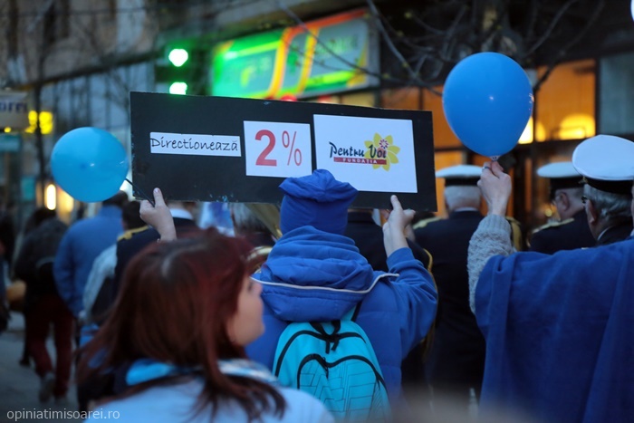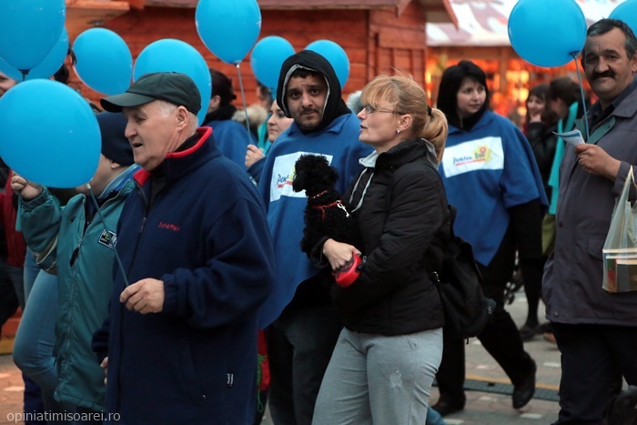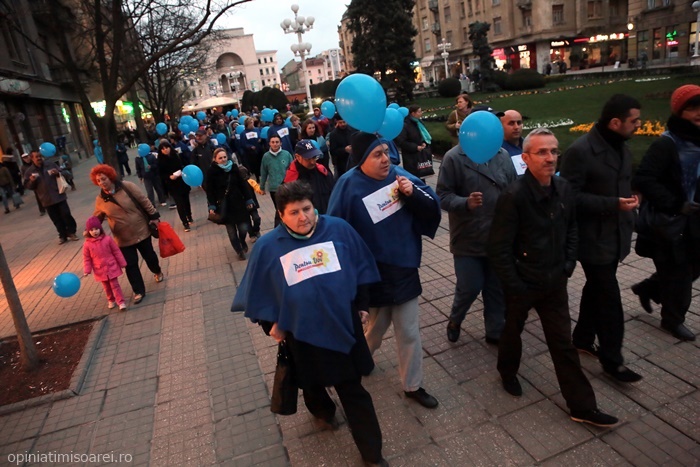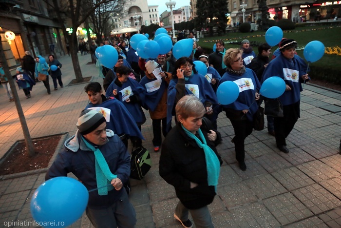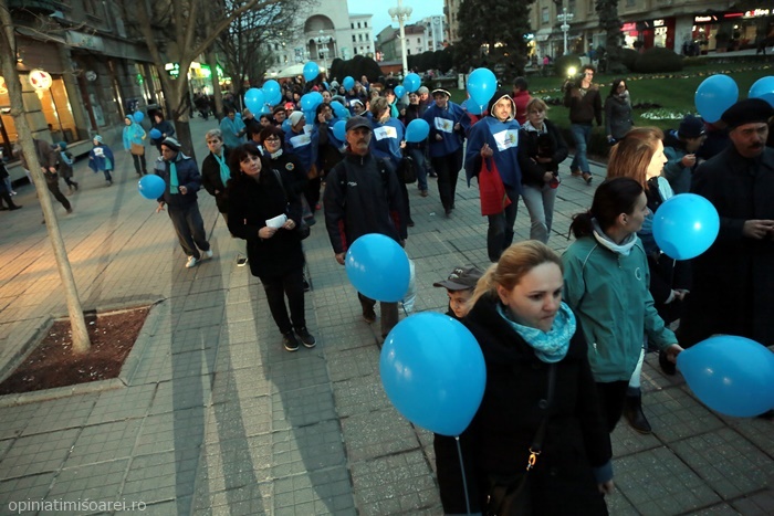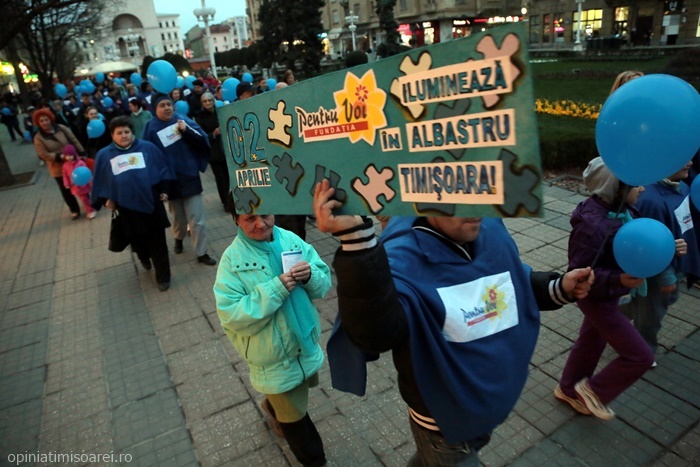 TIMISOARA. Capitala Banatului a purtat albastru joi seara, de Ziua Mondiala a Autismului. Aproape 200 de oameni cu dizabilitati intelectuale, familii si prieteni, dar si reprezentanti ai Fundatiei “Pentru Voi” au pornit intr-un mars prin centrul orasului, pentru a marca Ziua Mondiala a Autismului. La final, Opera Romana a fost iluminata in albastru, asa cum se intampla in fiecare an.
