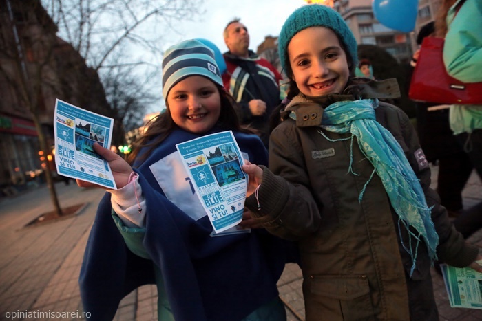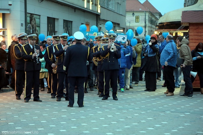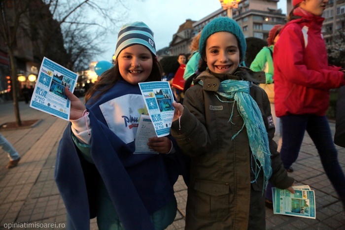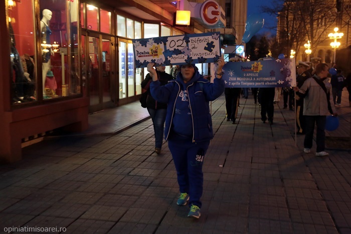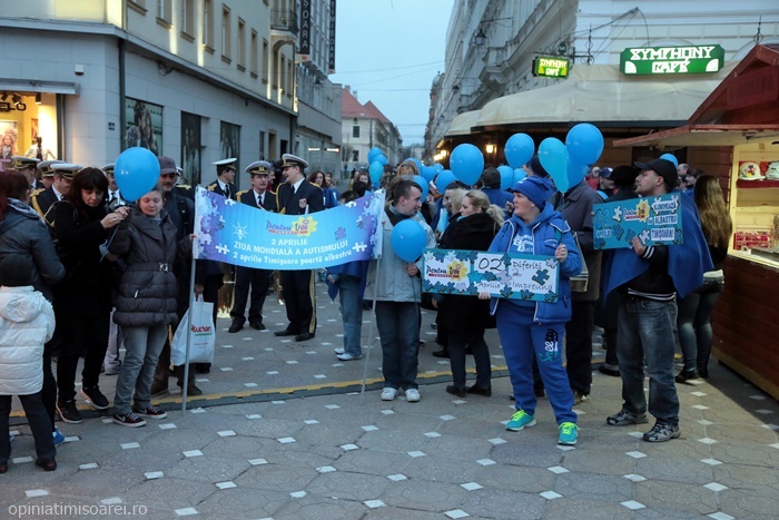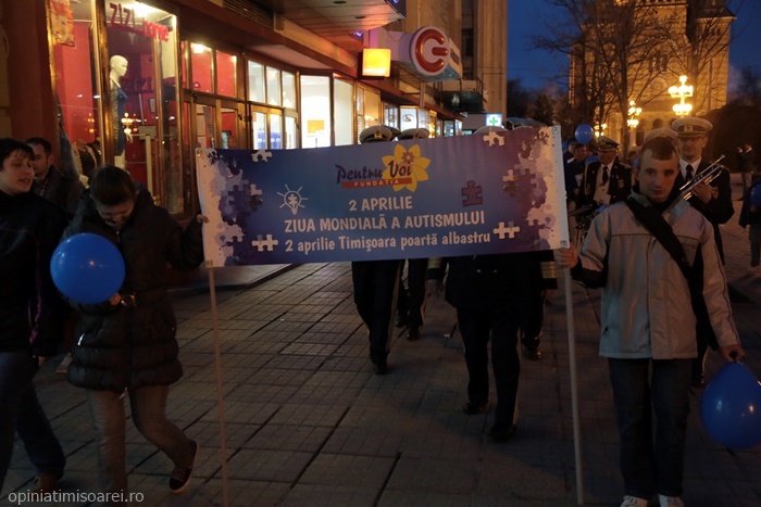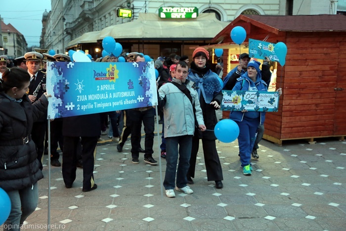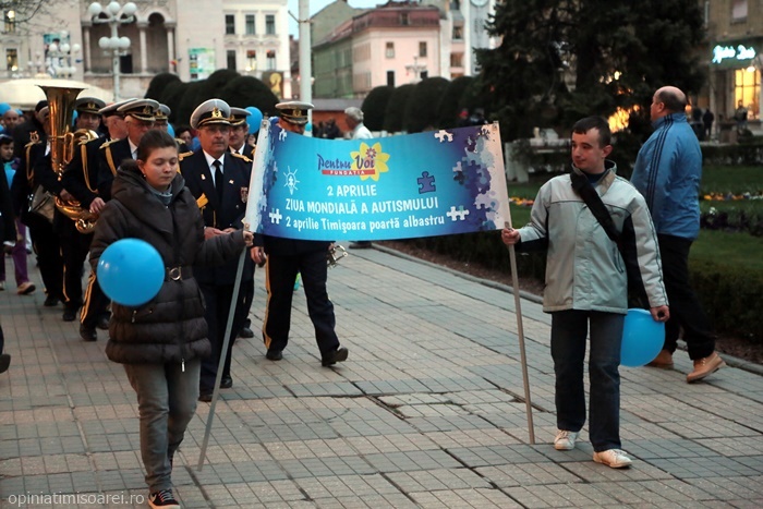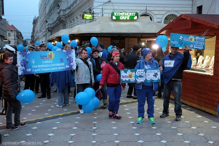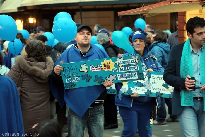 Participantii au vrut sa atraga atentia timisorenilor asupra acestei boli. Au purtat cu ei baloane albastre si pancarte cu diverse mesaje: “Ilumineaza in albastru Timisoara”, “2 aprilie, Timisoara poarta albastru” sau “Diferiti impreuna”. In mars li s-a alaturat si fanfara, iar la final au lansat lampioane albastre de pe platou din fata Palatului Culturii, ca simbol al sperantei si a acceptarii persoanelor bolnave de autism.
