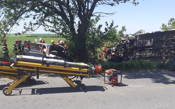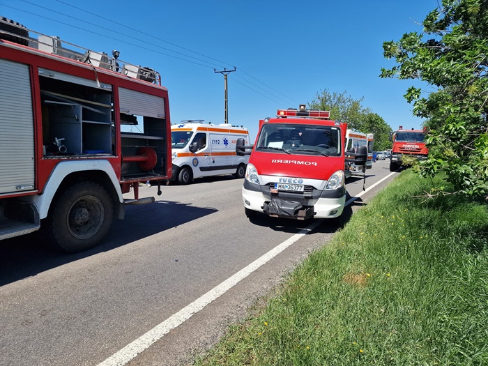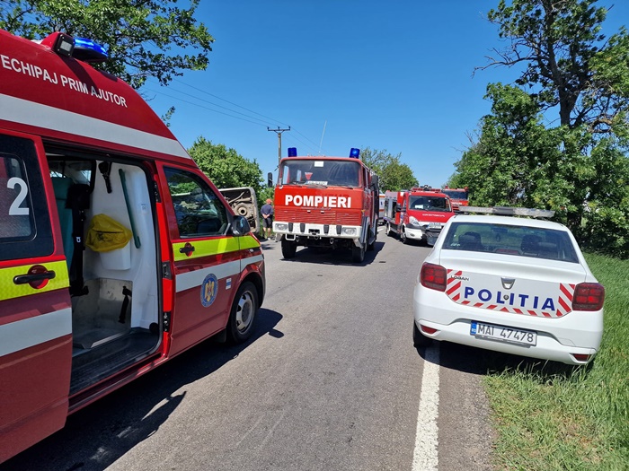 A intervenit ISU Arad cu o autospeciala de descarcerare usoara. In sprijin au fost trimise si doua ambulante SAJ, iar la fata locului a fost solicitat si elicopterul SMURD pentru preluarea unei victime.