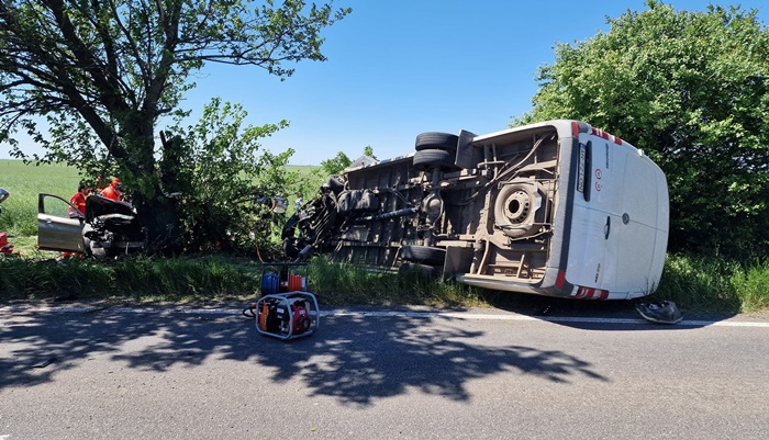 In microbuzul de transport persoane se afla doar soferul, iar in masina soferul si un pasager. Cele trei victime au ramas incarcerate.