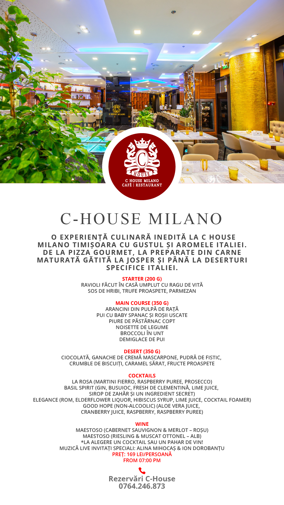 La C House Milano poți petrece o seară ca pe riviera italiană, cu muzică live. Starter-ul conține Ravioli home-made, la Main Course te bucuri de Arancini din pulpă de rață, pui cu baby spanac și roșii uscate, piure de păstârnac copt, noisette de legume, broccoli în unt și demiglace de pui. La desert vă îndulciți cu ciocolată, ganache de cremă mascarpone, pudră de fistic, crumble de biscuiți, caramel sărat și fructe proaspete. Intră pe Facebook-ul C House Milano să afli mai multe detalii, dar și să îți faci rezervare pentru cea mai romantică seară!