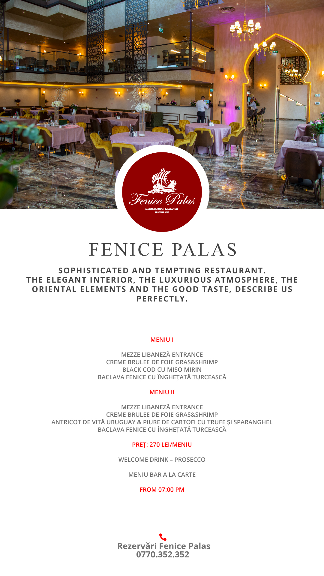 Dacă vă doriți o seară exotică, la restaurantul Fenice vă așteaptă o seară libaneză intensă și plină de savoare. Meniul I conține Mezze libaneză entrance, crème brûlée de foie gras & shrimp, black cod cu miso mirin, iar la desert baclava Fenice cu înghețată turcească. Iar Meniul II propune același prim fel și desert, însă la Main Course antricot de vită Uruguay & piure de cartofi cu trufe și sparanghel. Mai multe informații puteți afla accesând pagina de Facebook Fenice Palas Timișoara.