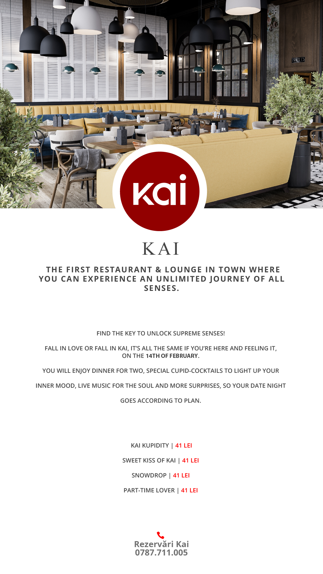 Vreți o seară relaxantă, unde să vă bucurați de momentele petrecute împreună? KAI aduce un concept ce îmbină restaurantul cu lounge experience, devenind astfel un loc efervescent.