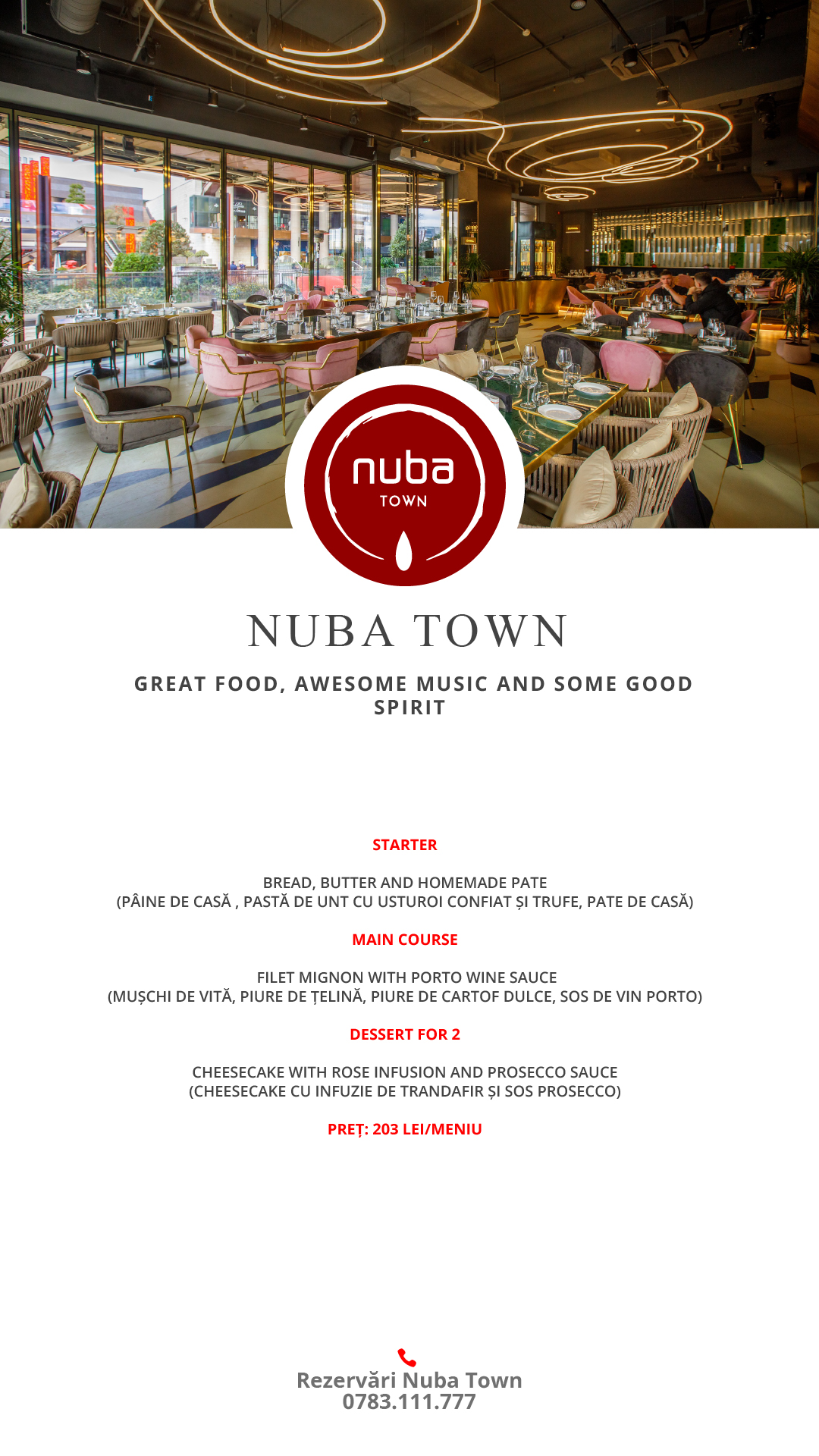 Nuba Town oferă îndrăgostiților o incursiune culinară în bucătăria internațională. Seara începe cu un Starter – bread, butter and home-made pâté – continuă cu Main Course – filet mignon with porto wine sauce – și se încheie cu Desert – Cheesecake with Rose infusion and Prosecco sauce.