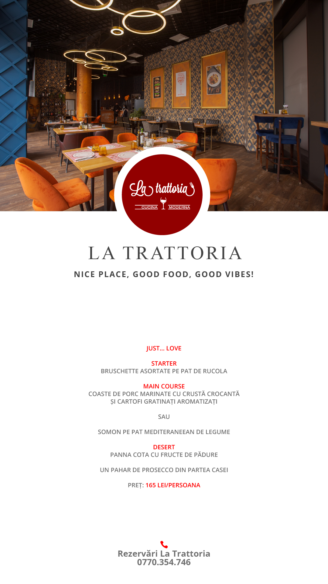 La Trattoria a pregătit un meniu special, ce conține preparate inspirate din una dintre cele mai romantice țări – Italia. Bruschette asortate pe pat de rucola, coaste de porc marinate cu crustă crocantă și cartofi gratinați aromatizați ori somon pe pat mediteraneean de legume, iar la desert clasica și delicioasa panna cota cu fructe de pădure și un pahar de Prosecco din partea casei. Programează-te pe pagina de Facebook La Trattoria.