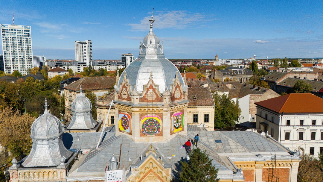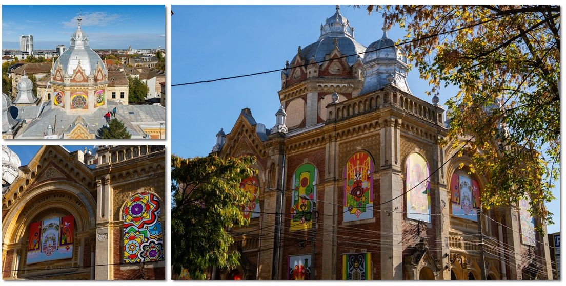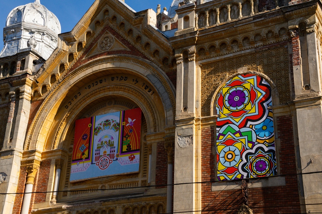 TIMISOARA. Sinagoga din Fabric, una dintre cele mai valoroase clădiri istorice ale Timișoarei, găzduiește din această toamnă o intervenție artistică temporară pe plăcile de OSB care protejează ușile, ferestrele și vitraliile monumentului pus recent în siguranță.