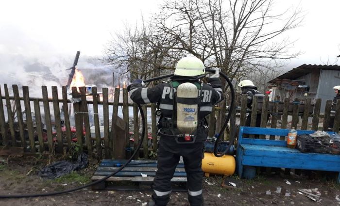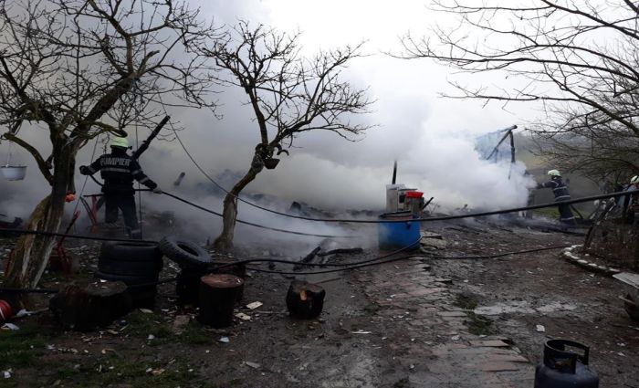 Incendiul a pornit, se pare, din cauza unor haine lasate la uscat pe soba, care au luat foc.