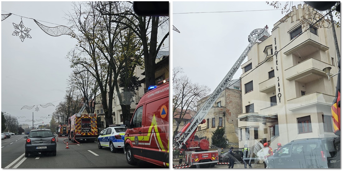 TIMIȘOARA. Intervenție de urgență a pompierilor la Hotel Savoy din Timișoara unde joi a izbucnit un incendiu la ultimul nivel.