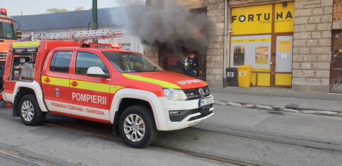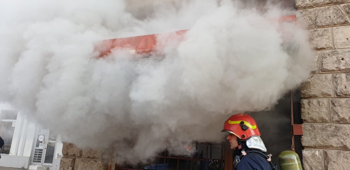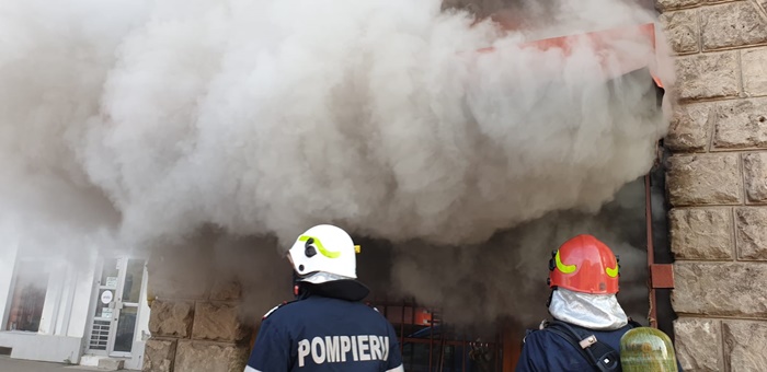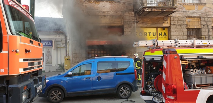 Un incendiu a izbucnit la un magazin de haine, iar fumul dens a invaluit cladirea si a inundat si o parte din strada.