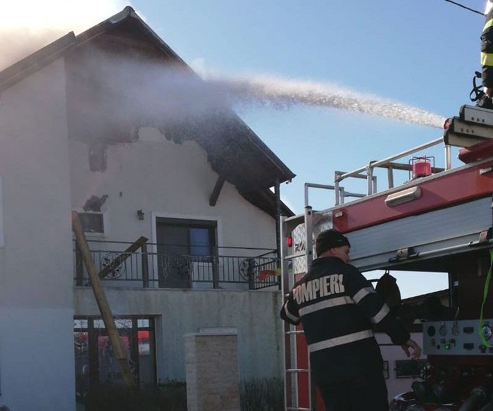 Pompierii lucreaza in continuare la stingerea incendiului, care a mistuit mansarda casei si acoperisul pe o suprafata de 200 mp, iar misiunea salvatorilor este ingreunata de vantul care sufla puternic in zona.