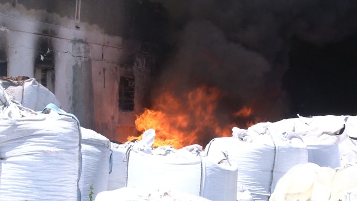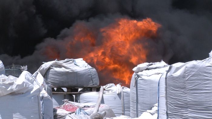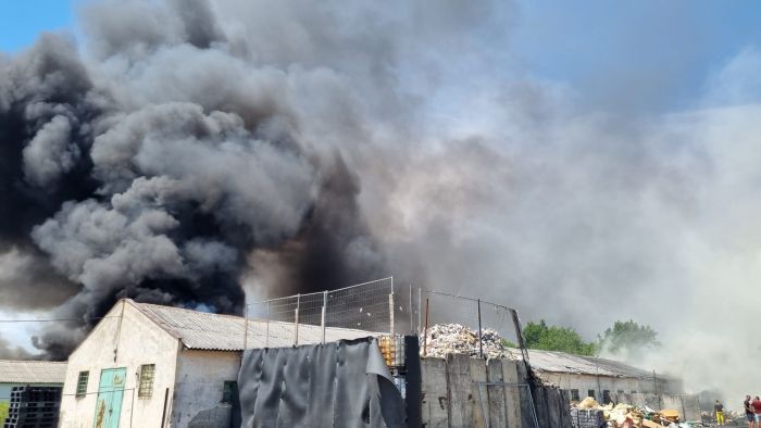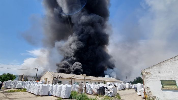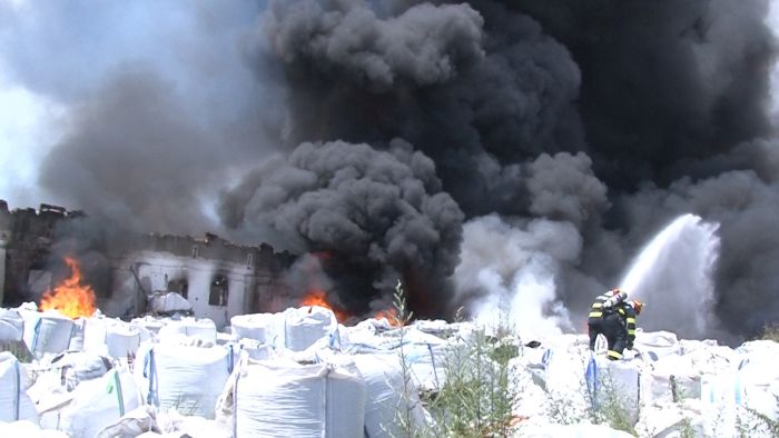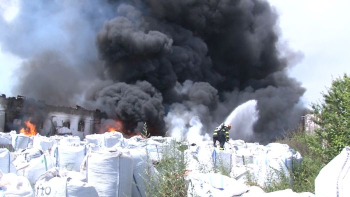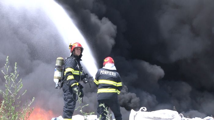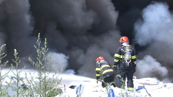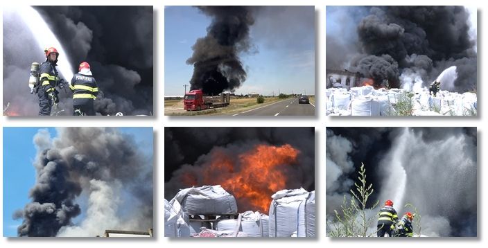 UPDATE: Potrivit reprezentantilor ISU Banat, suprafata afectata de incendiu este de 2000 de metri patrati de deseuri plastice aflate pe platforma si de 500 de metri patrati din acoperisul uneia dintre cladiri.