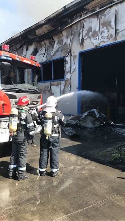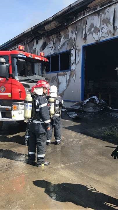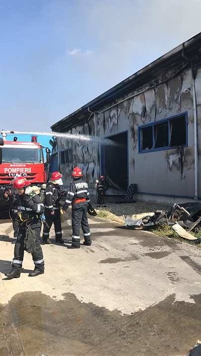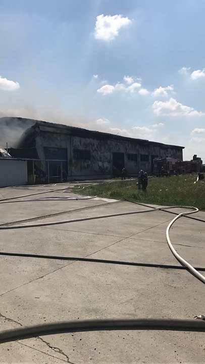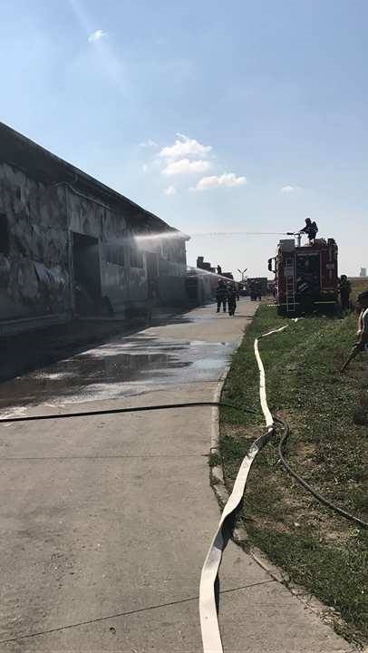 UPDATE: Pompierii se lupta cu flacarile de mai bine de doua ore. Flacarile au mistuit aproape intreg acoperisul halei si exista pericolul ca acesta sa se prabuseasca.