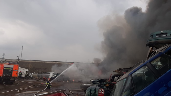 Flacarile au mistuit caroseriile unor masini dezafectate, ce erau depozitate una peste alta pe o suprafata de 400 de metri patrati.