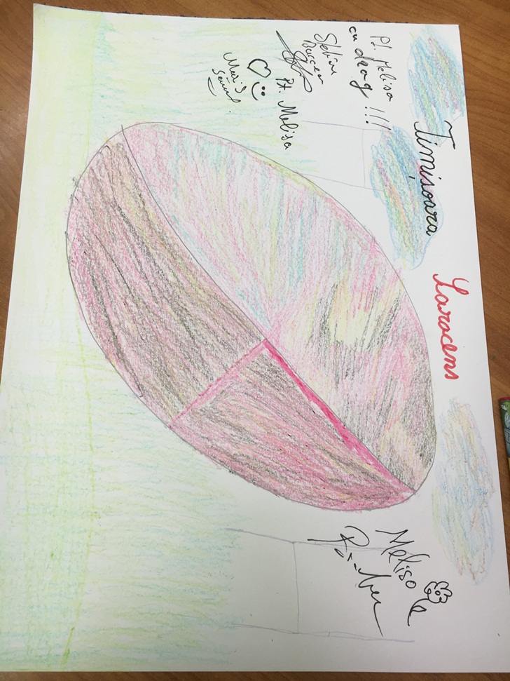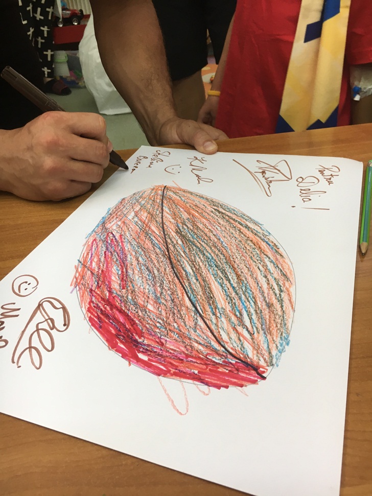 Micutii s-au intrecut apoi in desene cu rugbystii, pe care mai apoi le-au daruit, iar campionii, la randu-le, i-au rasplatit cu mingi si fulare cu insemnele clubului.