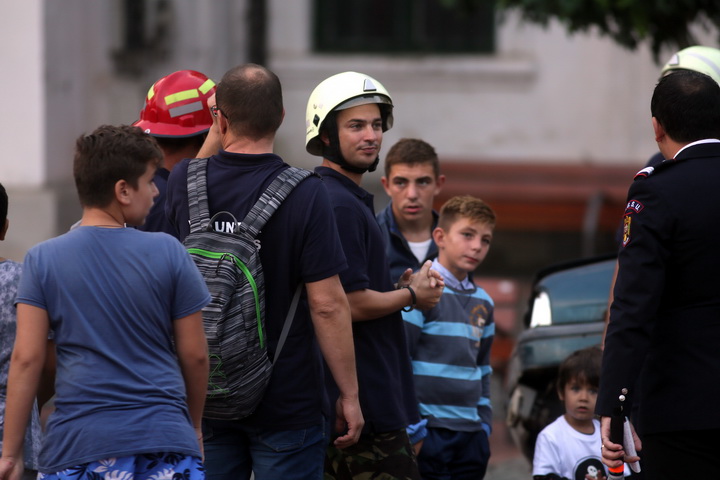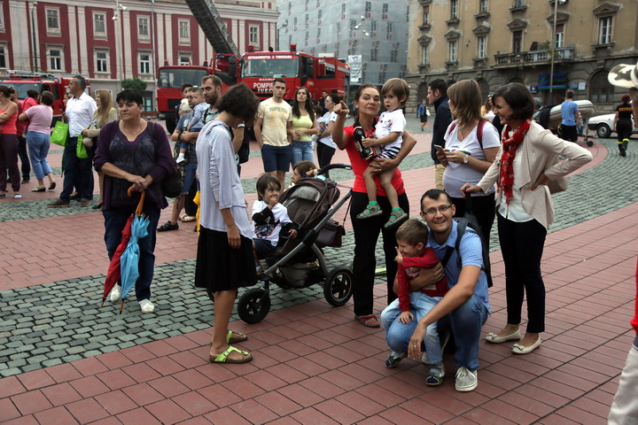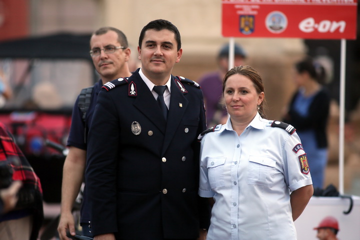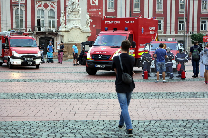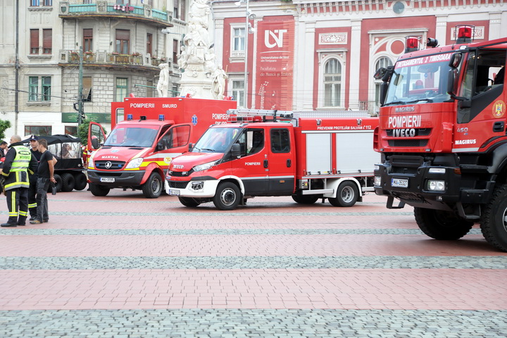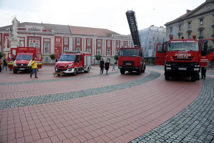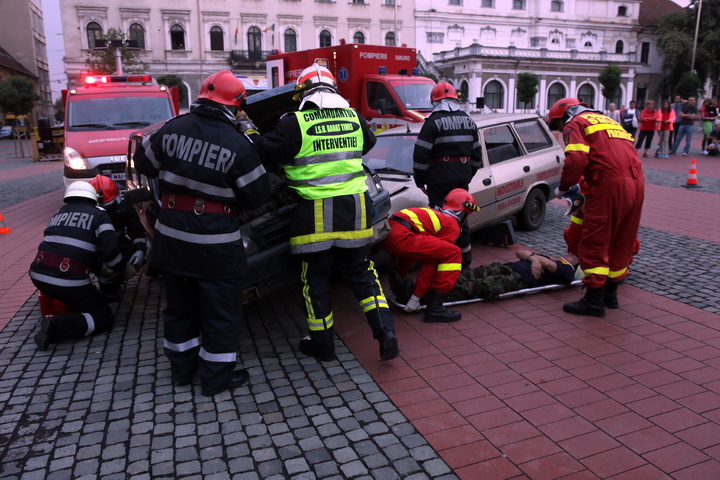 TIMISOARA. Cu un exercitiu descarcerare in urma unui accident rutier intre doua autoturisme! Asa isi vor sarbatori pompierii ziua la Timisoara. Marti seara, in Piata Libertatii, timisorenii i-au putut vedea pe pompieri in actiune.