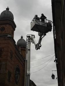La nici 48 de ore distanta de la sesizarea facuta in plen, pompierii au venit in fata Spitalului Militar cu ultima achizitie a Inspectoratului pentru Situatii de Urgenta, autospeciala de interventie la inaltime, si au indepartat tiglele ce puteau pica oricand.