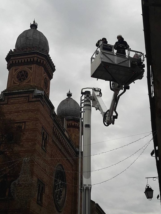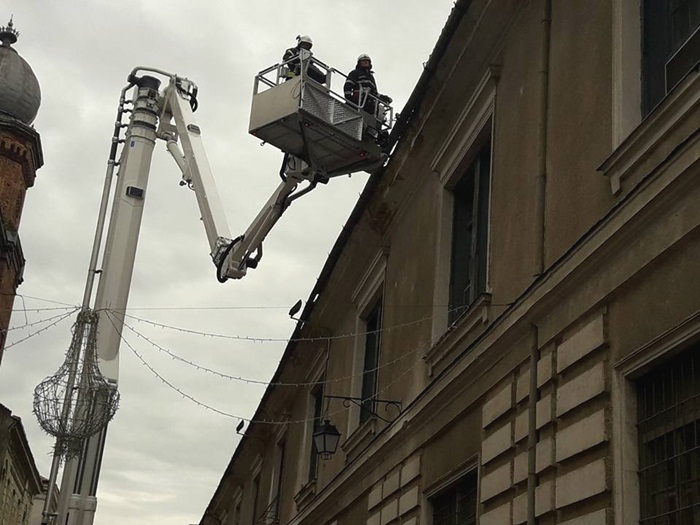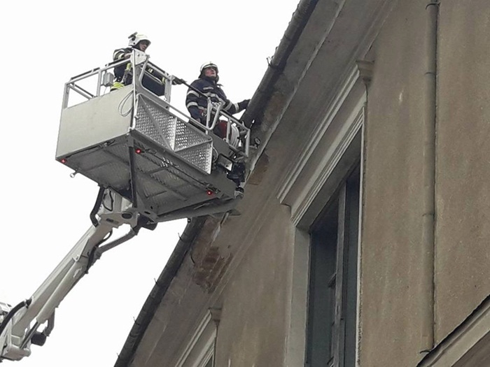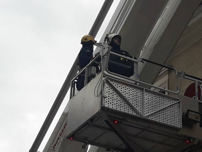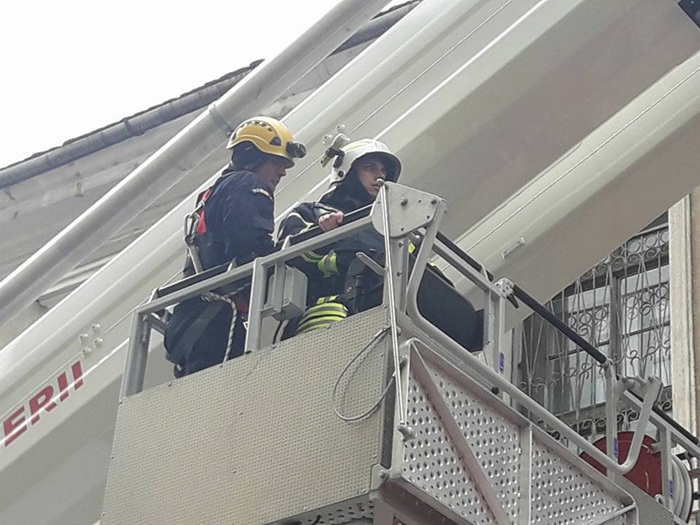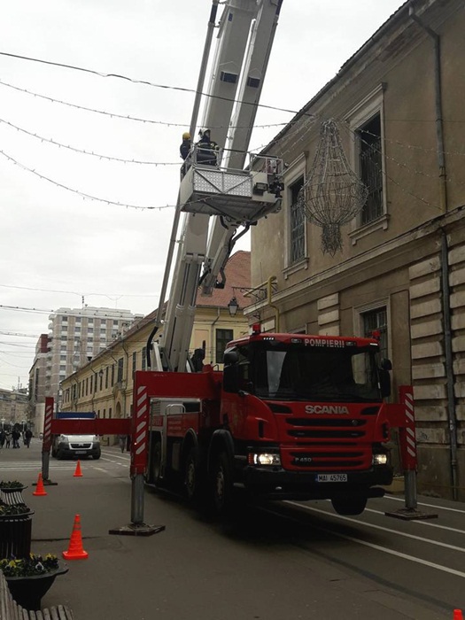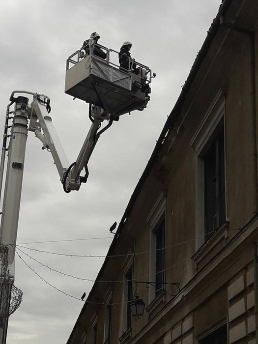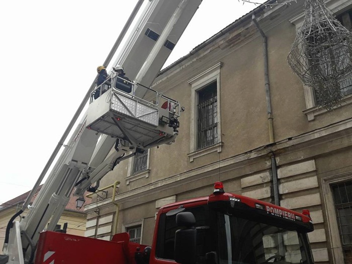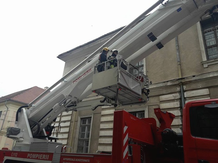 La nici 48 de ore distanta de la sesizarea facuta in plen, pompierii au venit in fata Spitalului Militar cu ultima achizitie a Inspectoratului pentru Situatii de Urgenta, autospeciala de interventie la inaltime, si au indepartat tiglele ce puteau pica oricand.
