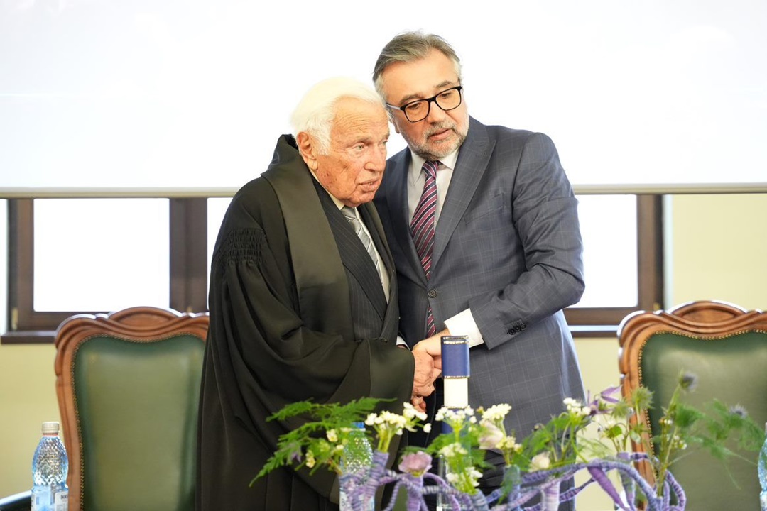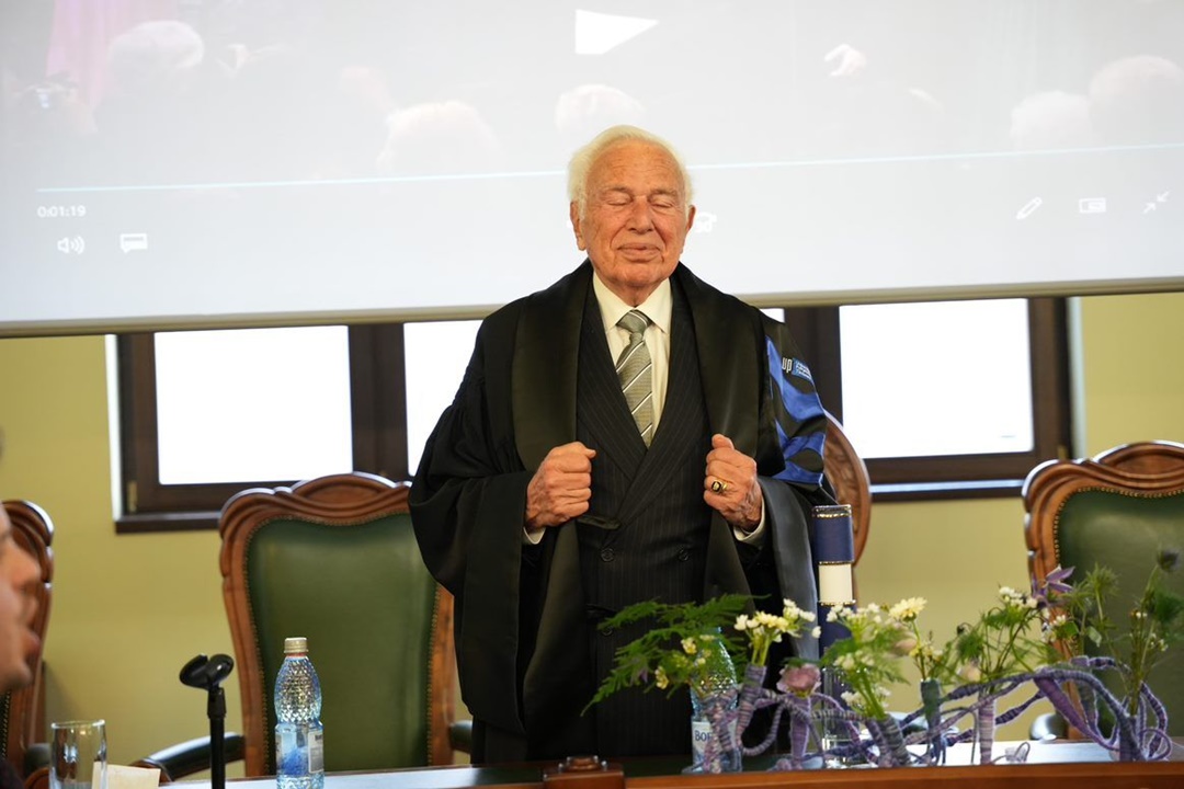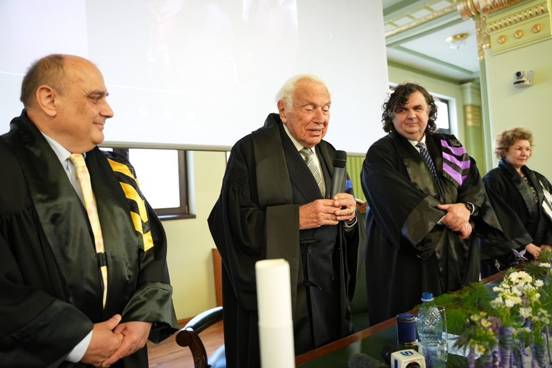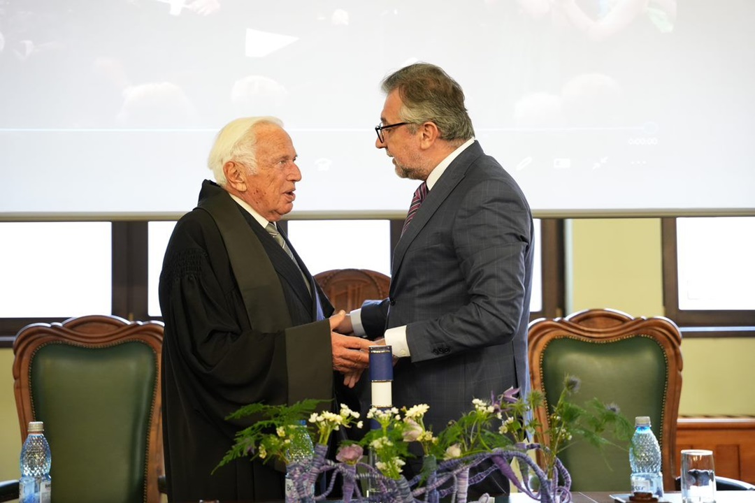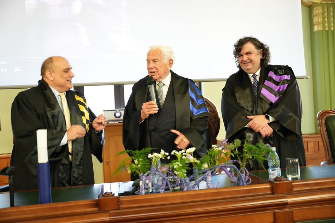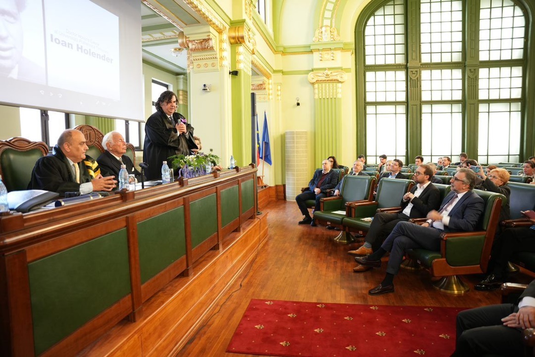 În continuare, Laudatio a fost citit de către prof.univ.dr.ing. Ștefan Kilyeni, un vechi prieten al maestrului, care a punctat principalele momente ale vieții și carierei lui Ioan Holender, o poveste demnă de un roman sau film.