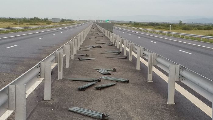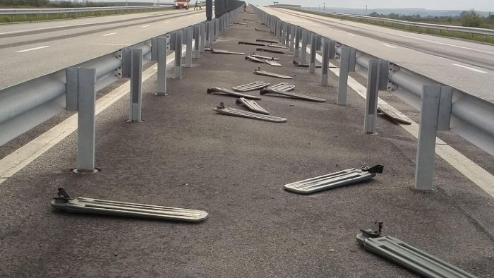 Vantul puternic a smuls aproape toate panourile antiorbire si le-a aruncat in mijlocul soselei de mare viteza.