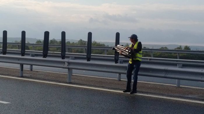 Mai multi soferi s-au trezit cu ele in parbriz si au fost nevoiti sa traga pe banda de rezerva a autostrazii.