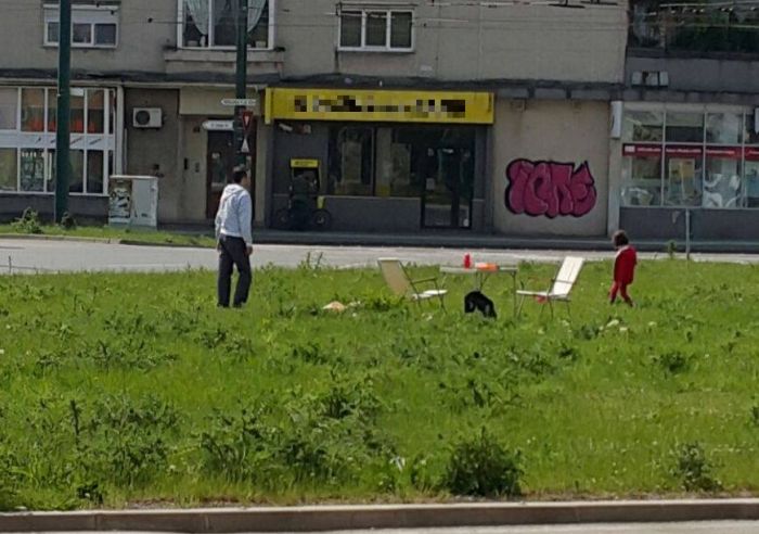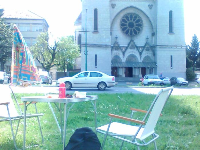 TIMISOARA. Daca nu ati plecat inca din oras de 1 Mai, puteti sarbatori Ziua Muncii alaturi de un timisorean, care a strigat adunarea la un picnic chiar in mijlocul intersectiei. Omul si-a luat masuta pliabila cu doua scaune si s-a pus in mijlocul intersectiei din Piata Balcescu.