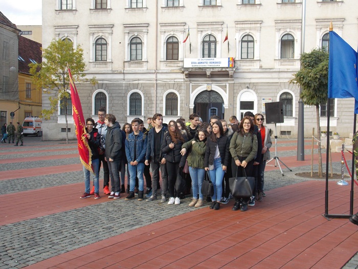 Militari aliniati in Piata Libertatii, in pozitie de drept si cu arma lipita de piept, i-au asteptat pe timisorenii curiosi de Ziua Armatei la Timisoara. Alaturi de soldati au fost prezenti in piata si un grup de elevi de clasa a zecea de la colegiul Vlad Tepes, care aveau in maini steagul liceului.