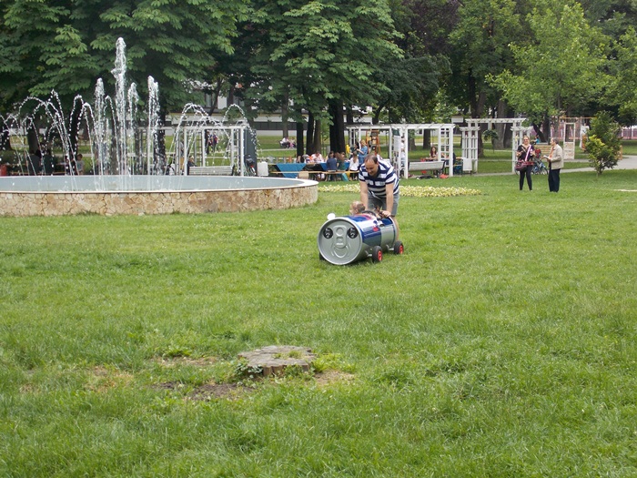 Una dintre cele mai mari distractii a fost plimbatul pe iarba cu o masinuta improvizata.