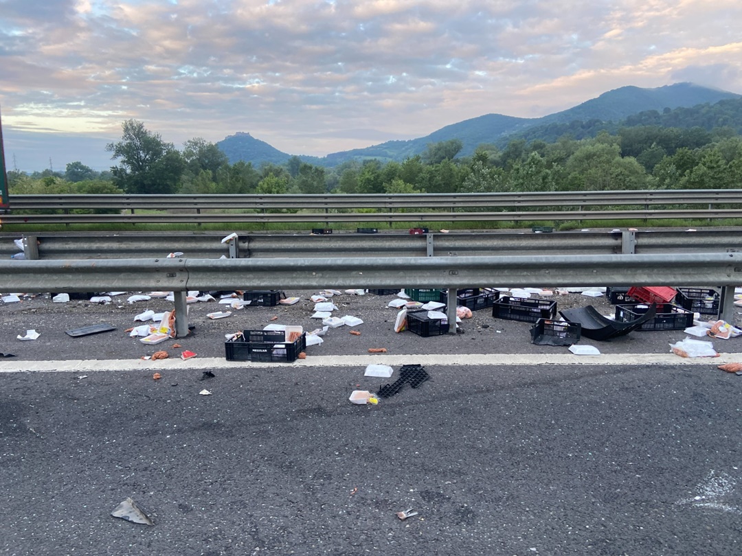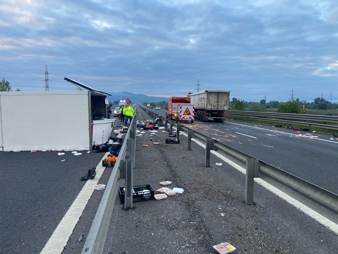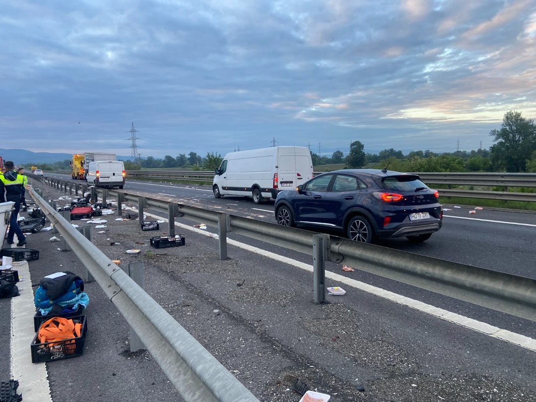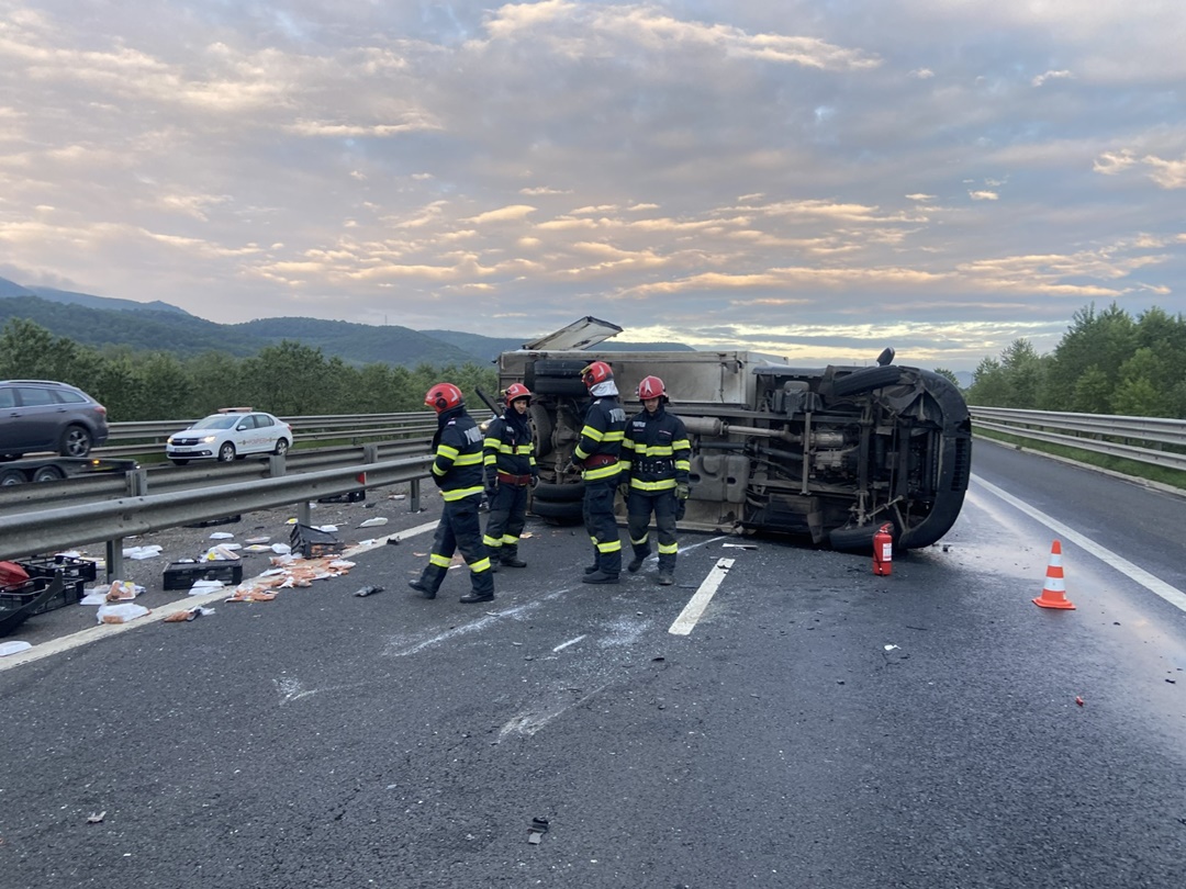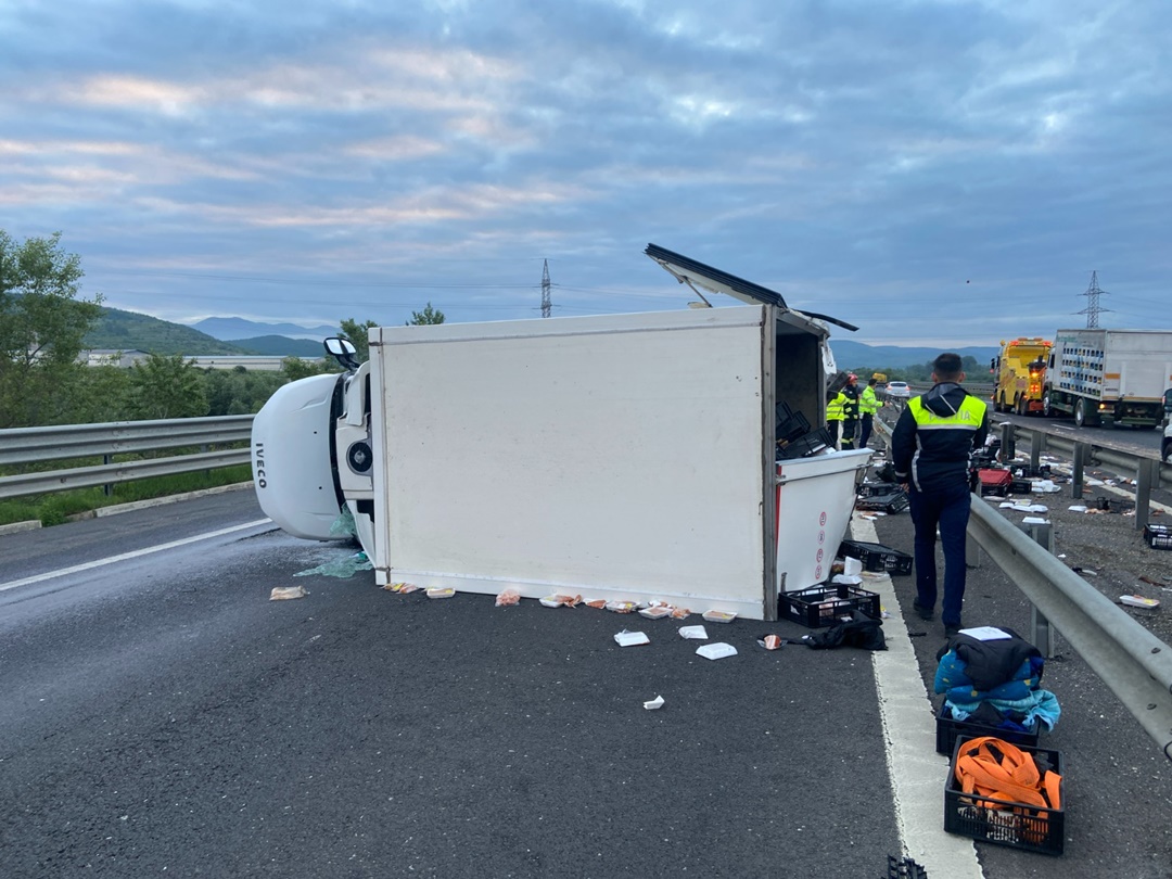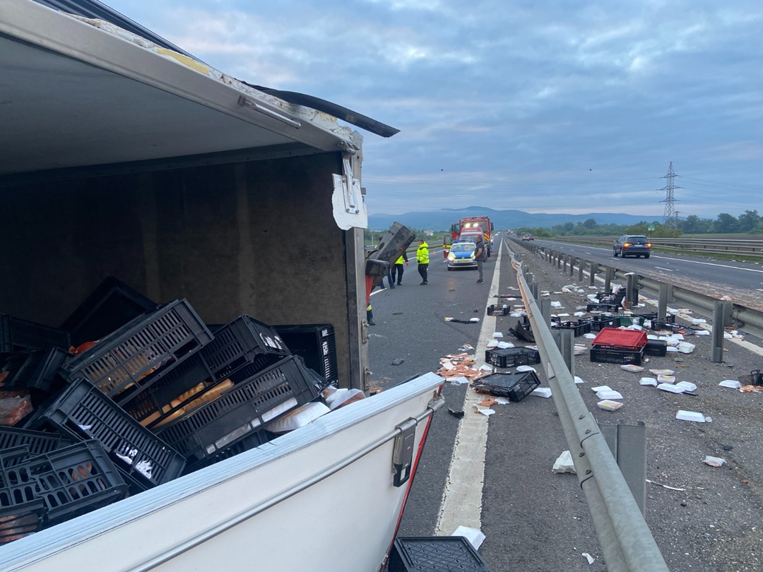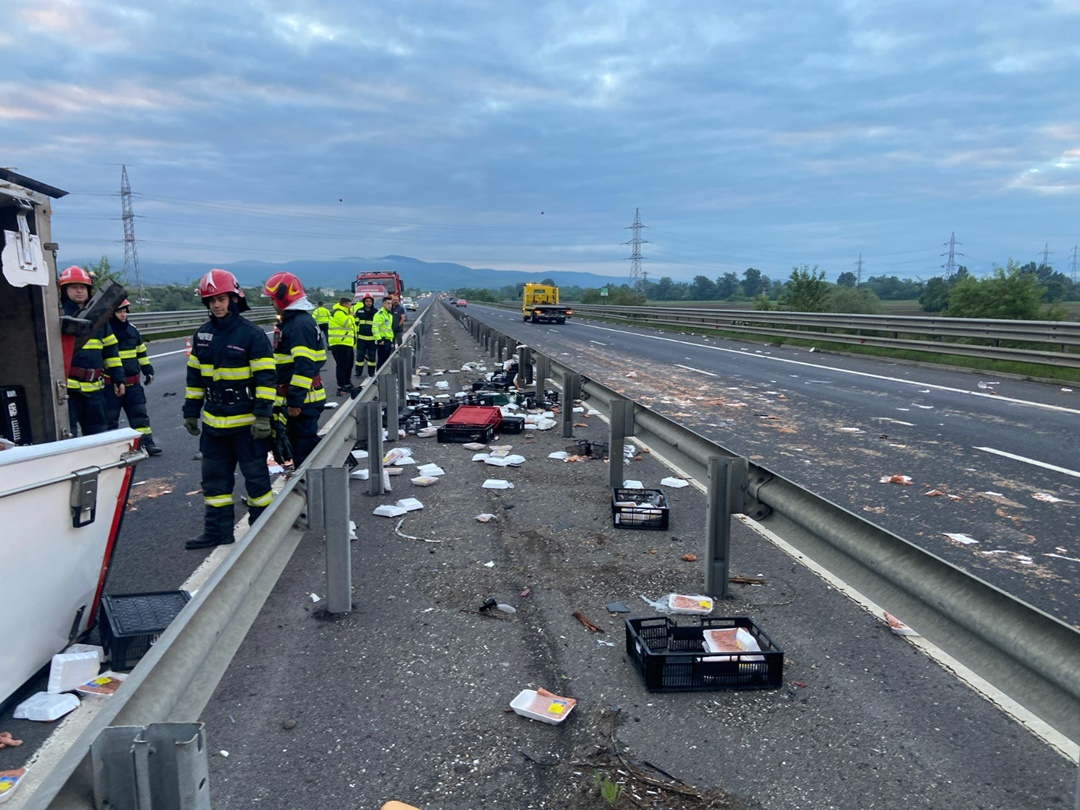 Doua dubite de marfa s-au izbit puternic, iar una dintre ele s-a rasturnat pe soseaua de mare viteza.