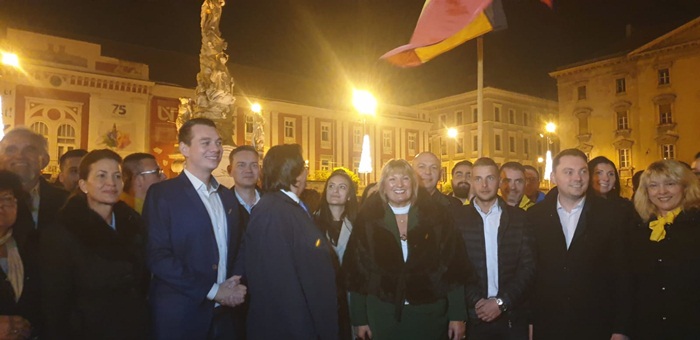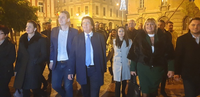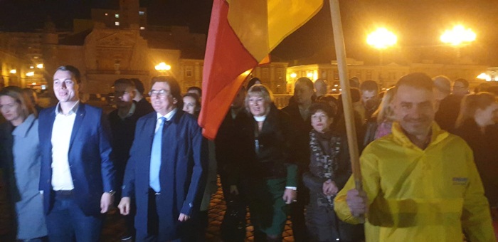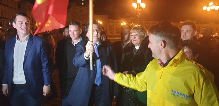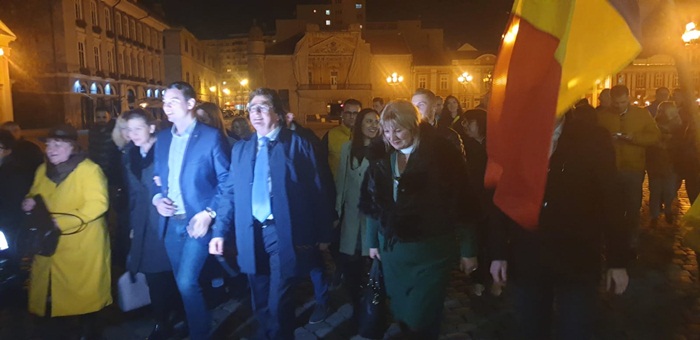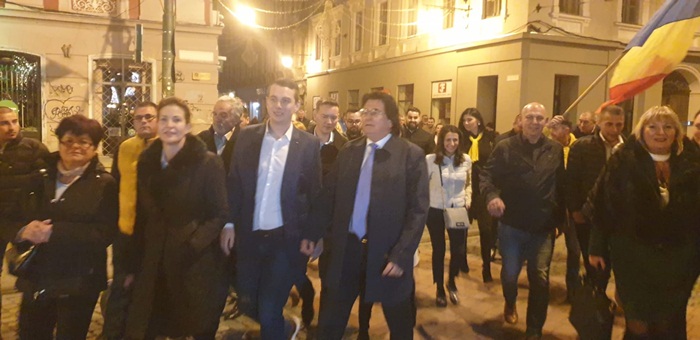 In frunte cu Nicolae Robu, fluturand drapelul national, cei aproximativ 50 de liberali au mers in Piata Unirii, apoi in Piata Libertatii si in Victoriei. Pe drum au scandat numele lui Iohannis si PNL si si-au facut fotografii.